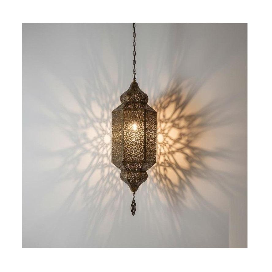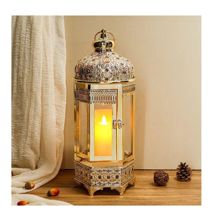 โคมไฟเทียนรูปหกเหลี่ยมสีทองแบบโมร็อกโก หรือโคมไฟโลหะโมร็อกโก โคมไฟตกแต่งสำหรับเทศกาลอีดและรอมฎอน
