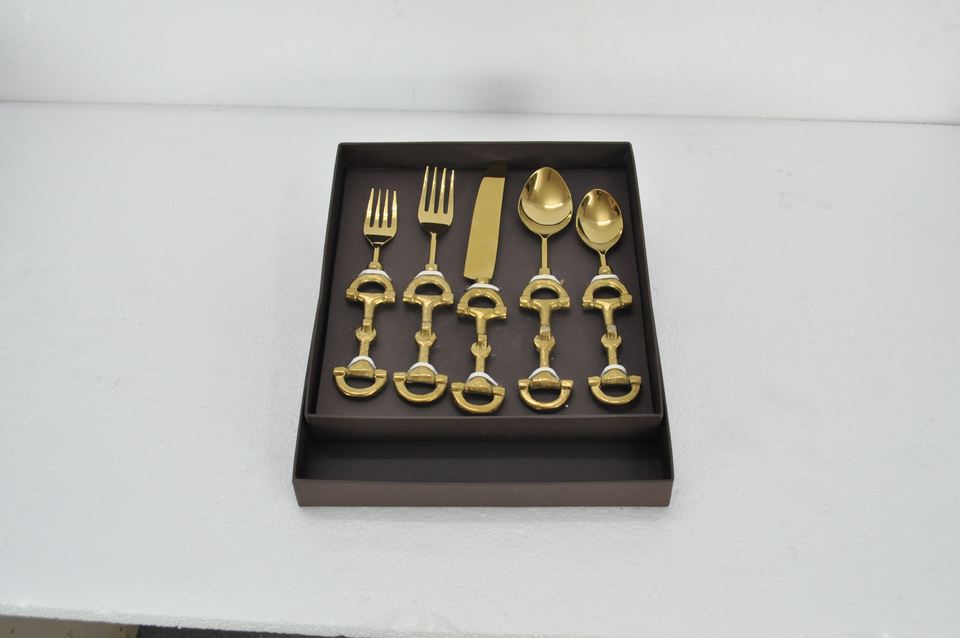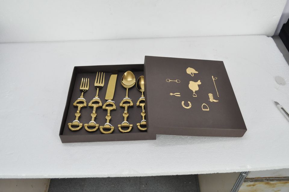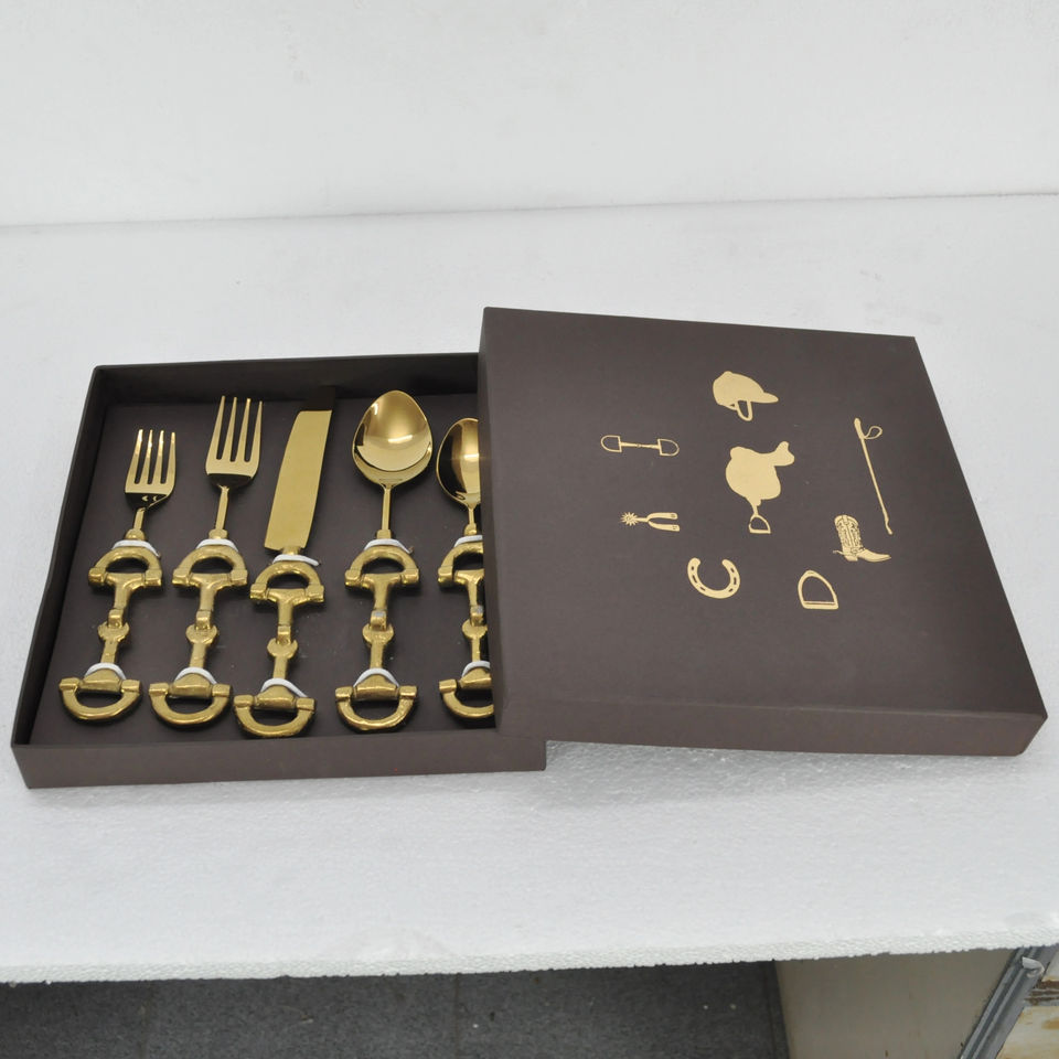 ชุดช้อนส้อมทองคำลายม้า ดีไซน์สำหรับนักขี่ม้า เคลือบ PVD สีทอง ชุดอุปกรณ์รับประทานอาหารหรูหรา พร้อมกล่องของขวัญสีดำแบบกำหนดเอง