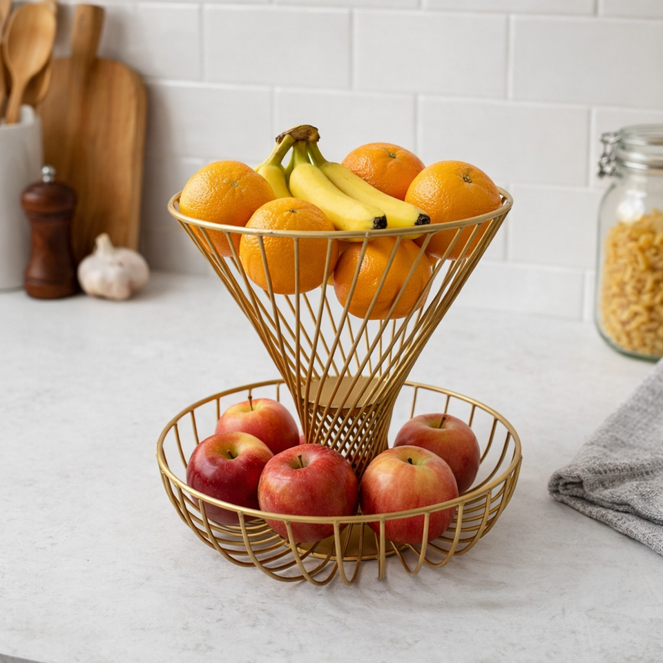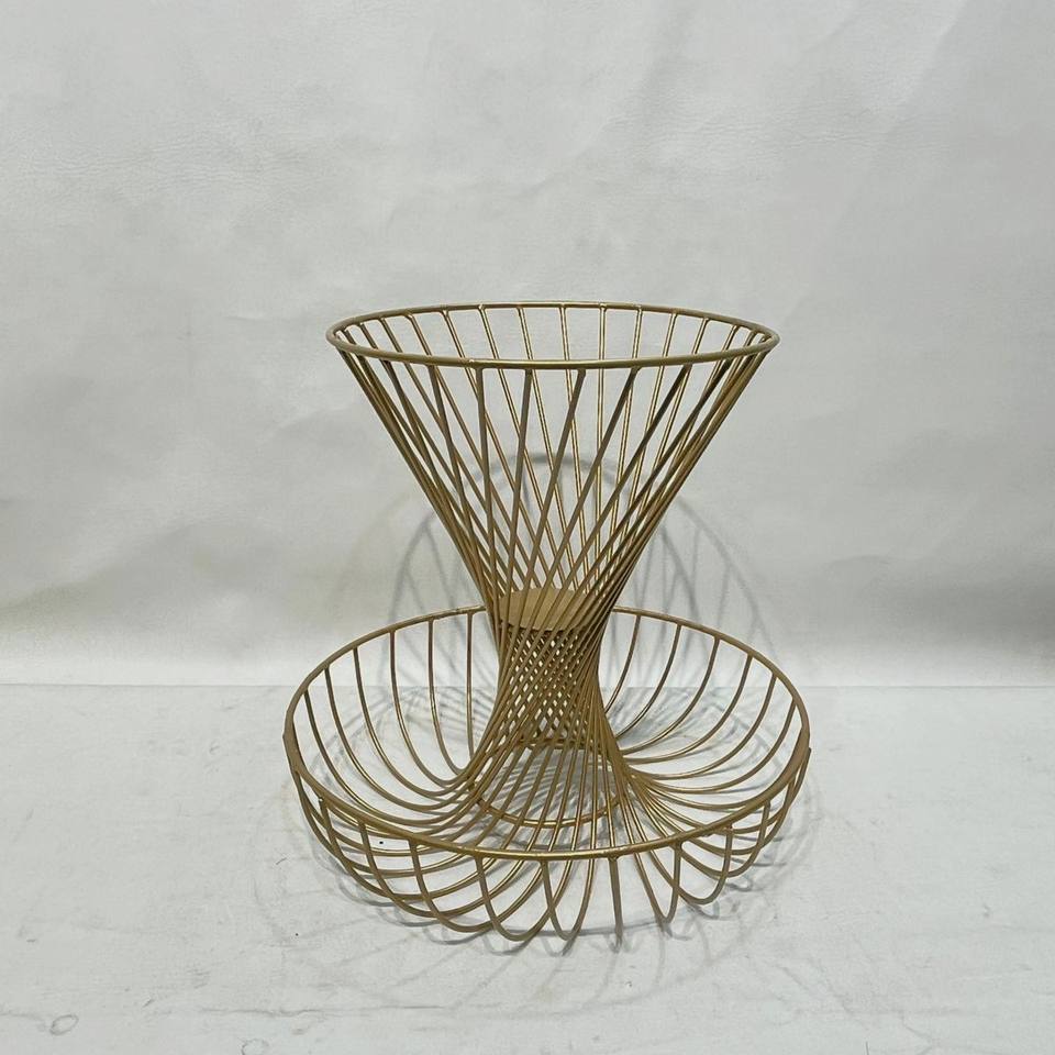 ตะกร้าผลไม้สองชั้นลวดเหล็กสีทอง ชั้นวางจานโลหะทันสมัยสำหรับวางบนเคาน์เตอร์ครัว ของตกแต่งบ้าน ขายส่ง