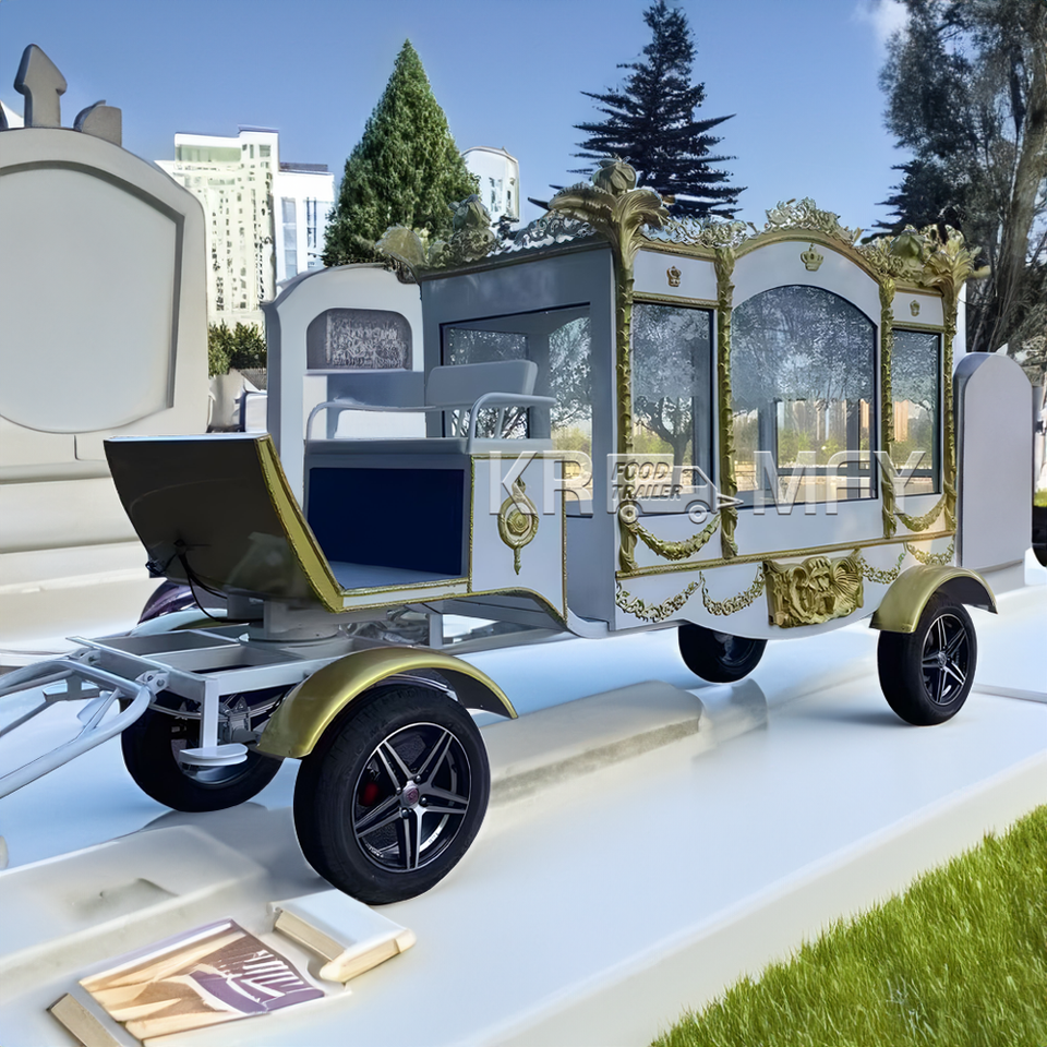 รถม้าศพสุดหรูหุ้มทองคำ พร้อมเตียงนอนเหล็กแบบไฟฟ้า ใช้ได้สองแบบ ทั้งรถม้าและรถบรรทุก พร้อมที่นั่ง 4-6 ที่นั่ง