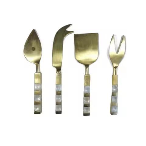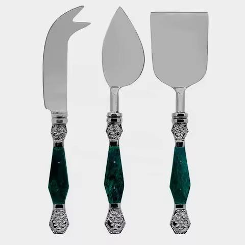 ชุดมีดหั่นชีสและมีดส้อมมีดสแตนเลสขัดเงาสีเงินดีไซน์วงทอง