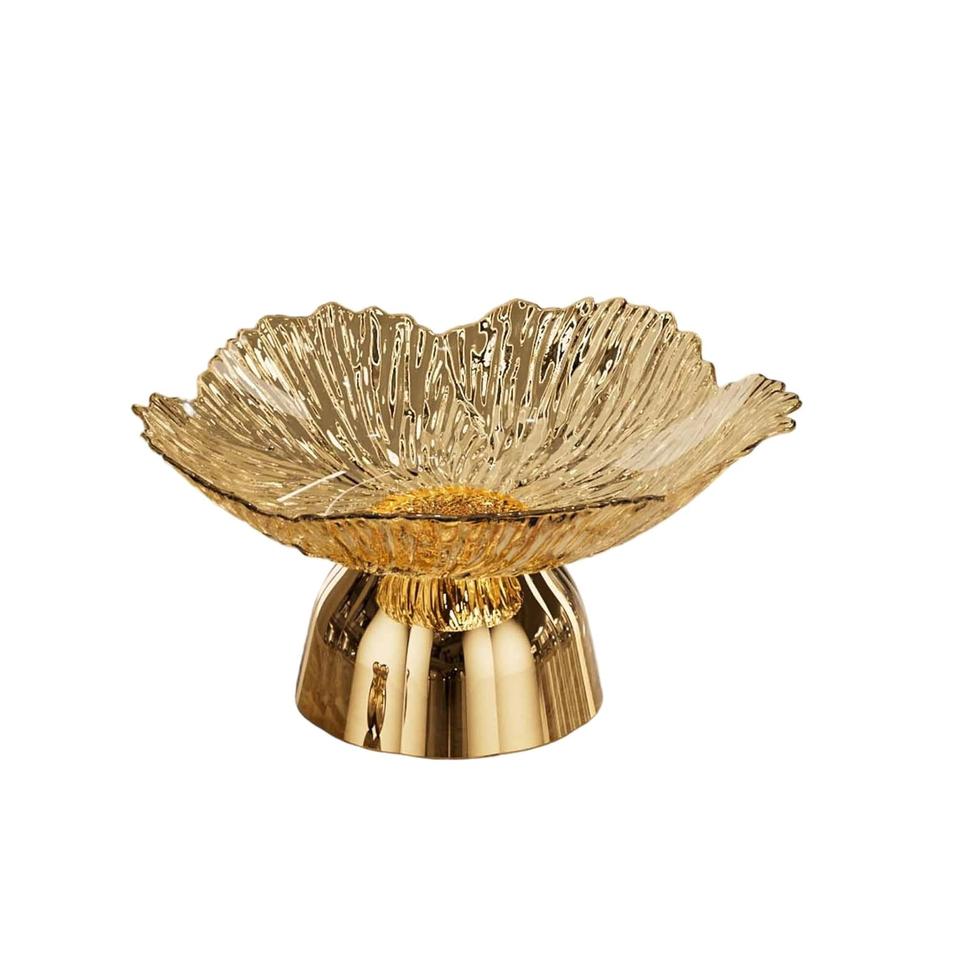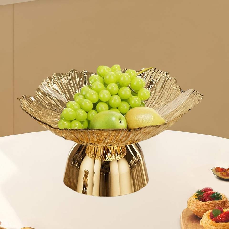 ถาดเสิร์ฟทรงสูงตกแต่งด้วยโลหะสีทอง สำหรับใส่ผลไม้ ขนมหวาน ของตกแต่งห้องรับแขก เหมาะเป็นของขวัญขึ้นบ้านใหม่