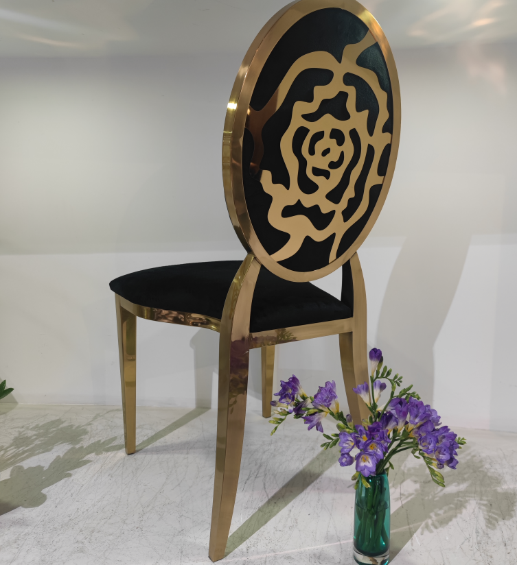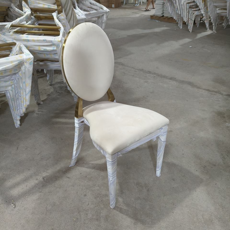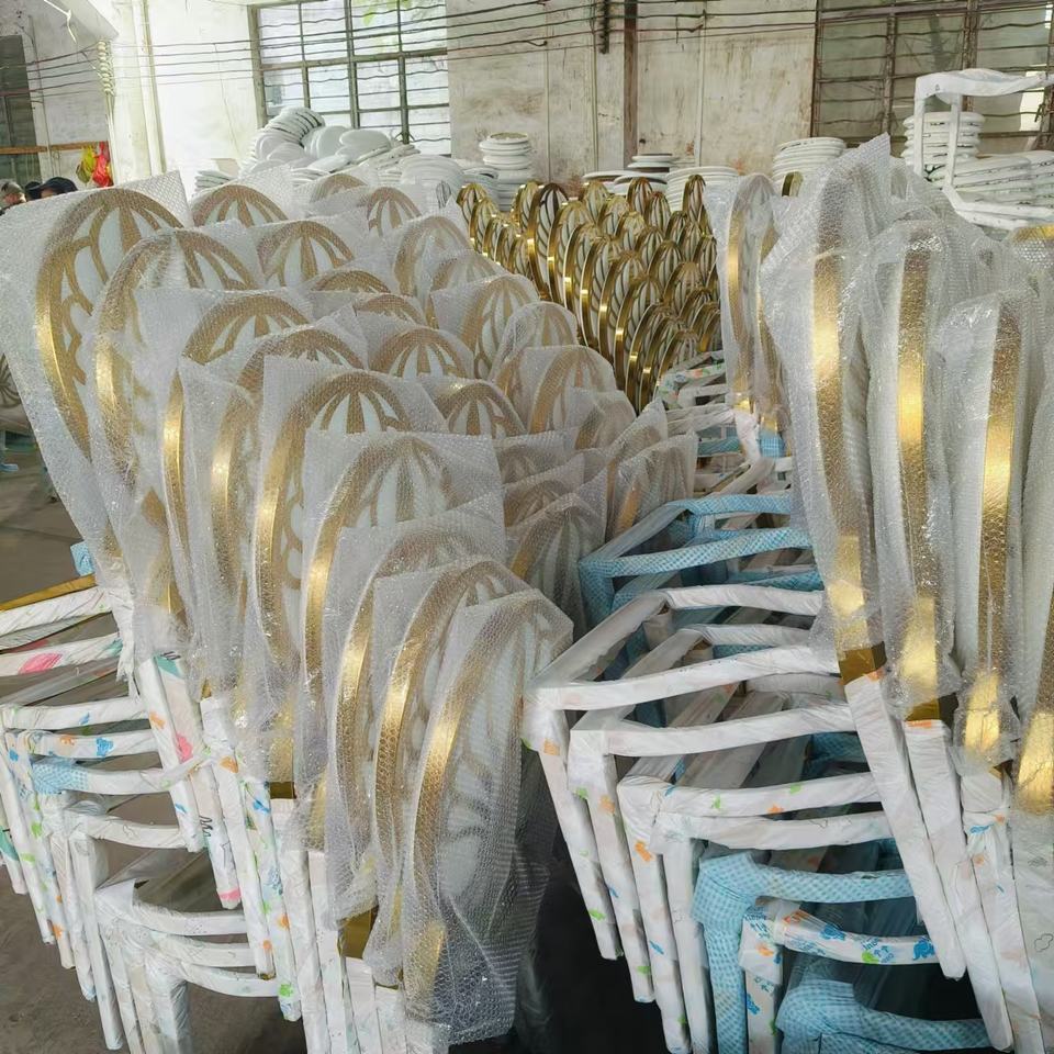 เก้าอี้รับประทานอาหารดีไซน์กรอบโลหะสีทองเก้าอี้จัดเลี้ยงและโต๊ะเก้าอี้จัดงานแต่งงานโรงแรมเก้าอี้สแตนเลสที่ทันสมัย