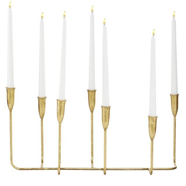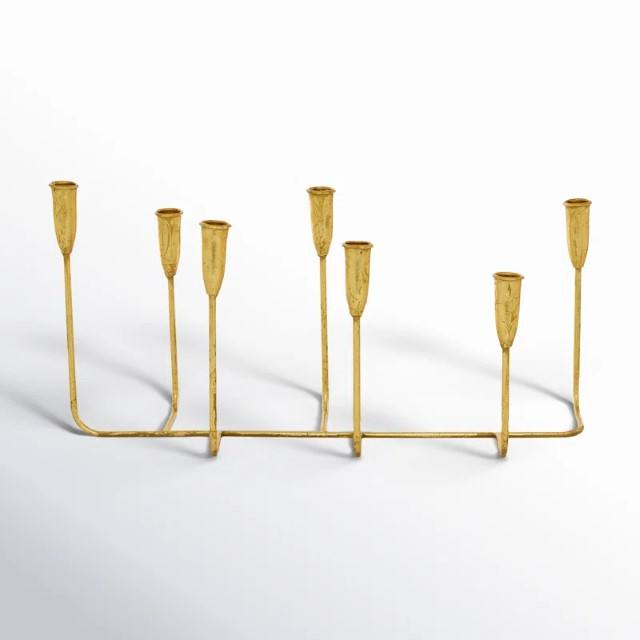 เชิงเทียนโลหะสีทองเพรียวบางเจ็ดชิ้นเป็นชิ้นส่วนตกแต่งที่ออกแบบมาเพื่อเก็บเทียนได้ถึงเจ็ดชิ้นบนโต๊ะ