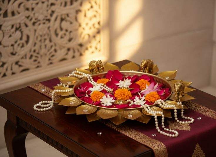ชาม urli โลหะสีทองสำหรับตกแต่งแบบอินเดียดั้งเดิมพร้อมกลีบดอกที่ลอยและการจัดแสงเทียน