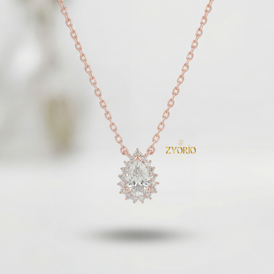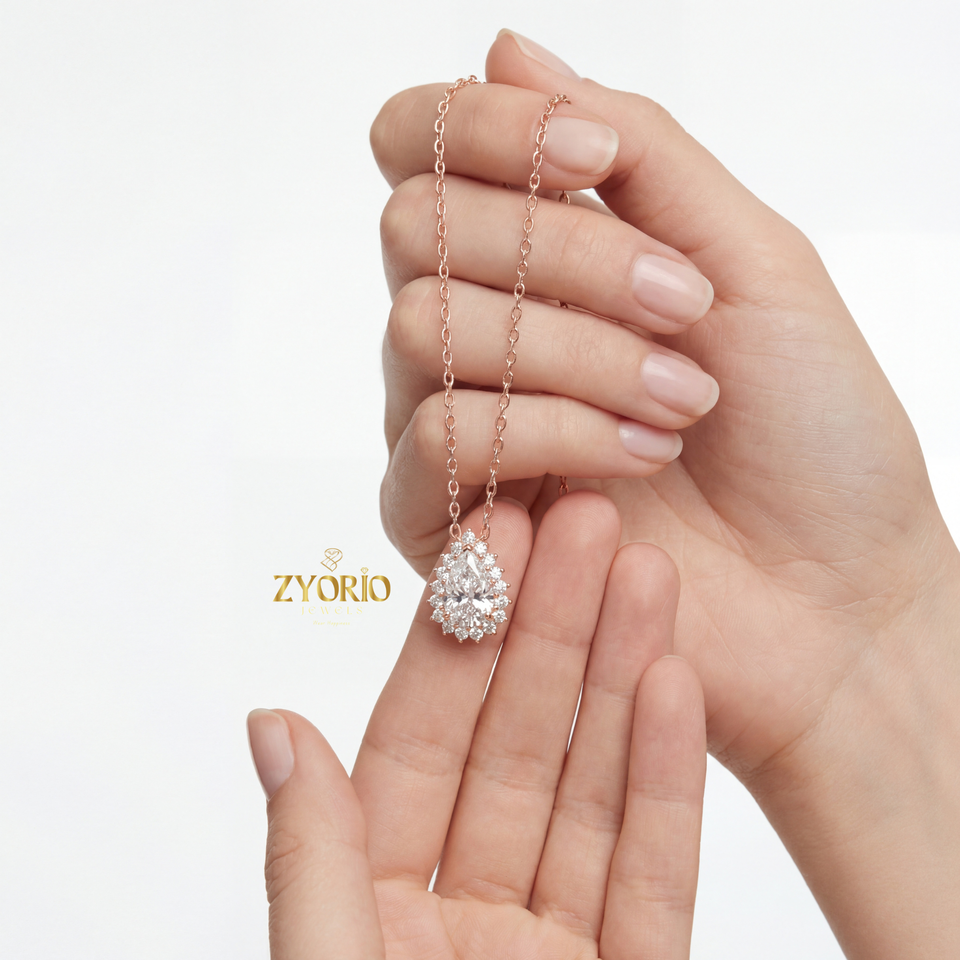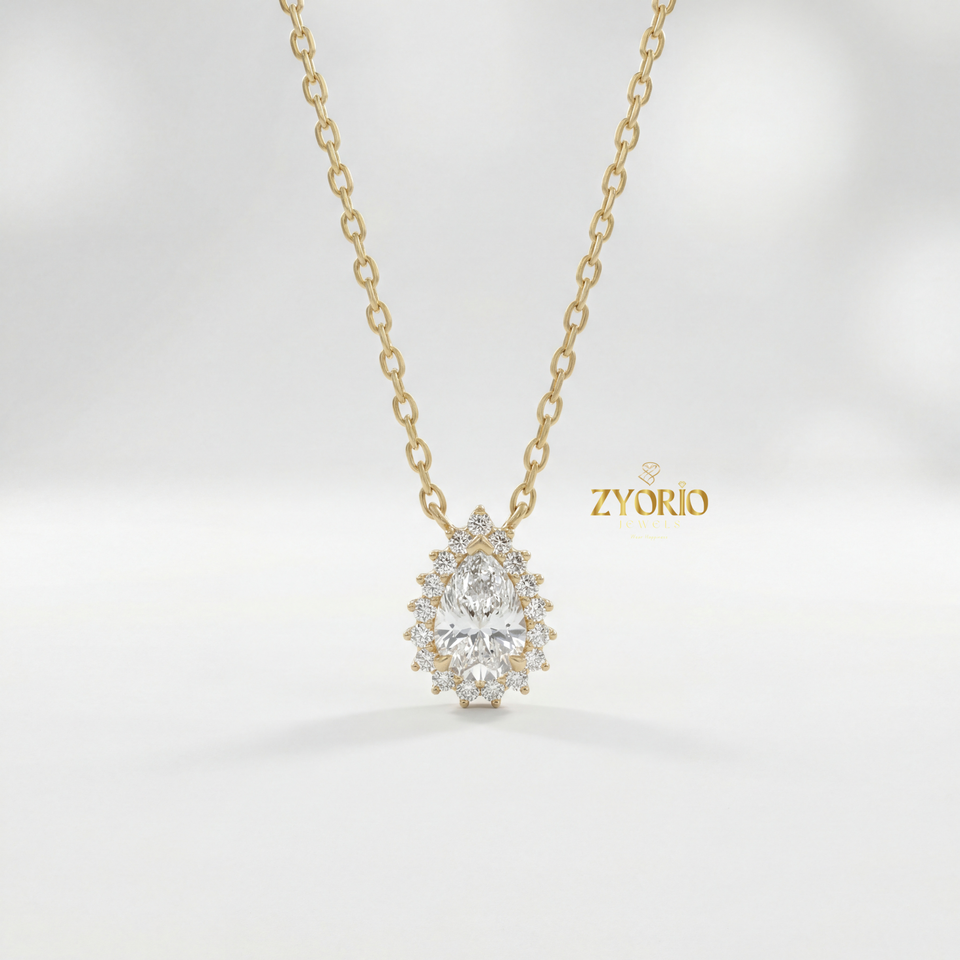 จี้เพชรรูปลูกแพร์สีทองหรูหราพร้อมเพชรประกายห่วงโซ่ดีไซน์เหนือกาลเวลาสำหรับงานแต่งงานและงานครบรอบ
