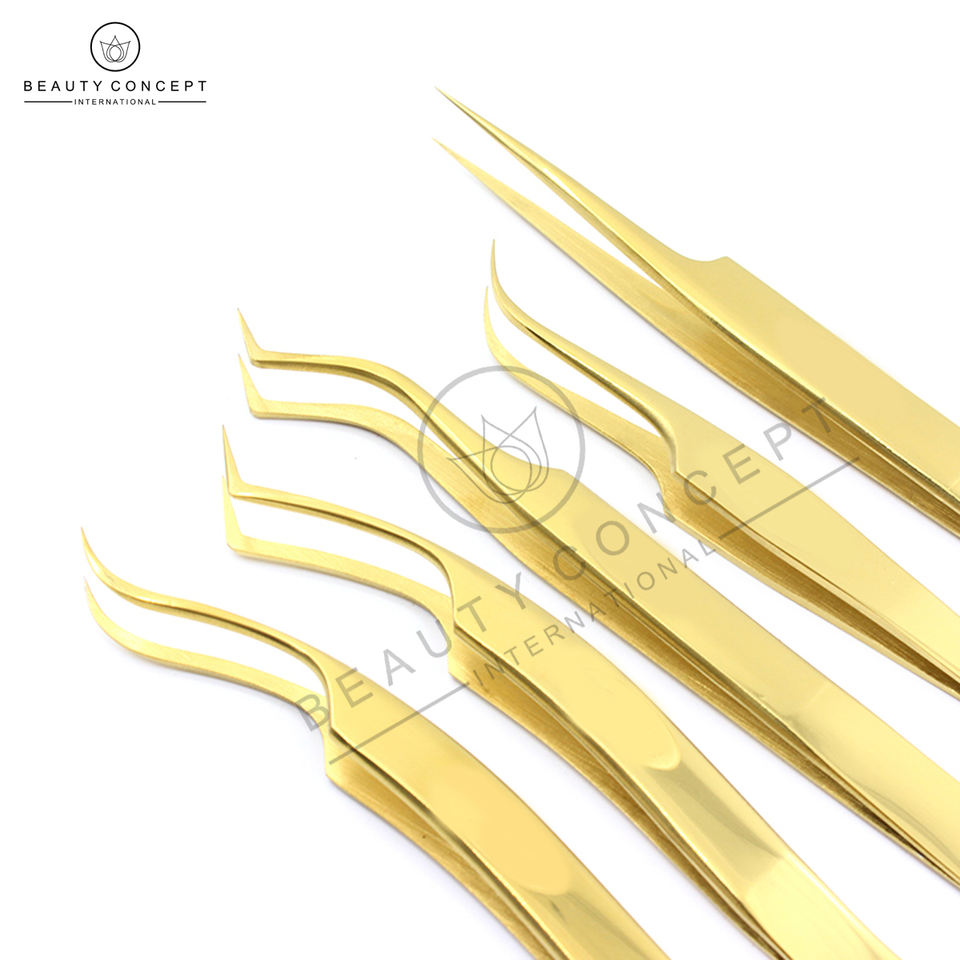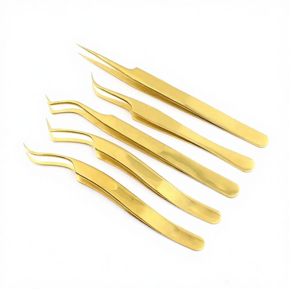 ชุดแหนบต่อขนตาสแตนเลสสีทองพลาสม่า 5 ชิ้น สำหรับต่อขนตาแบบวอลลุ่ม ปลายแหลมคม สวยงาม ระดับนานาชาติ