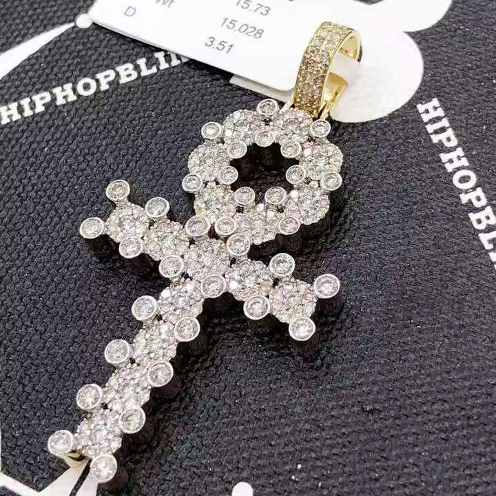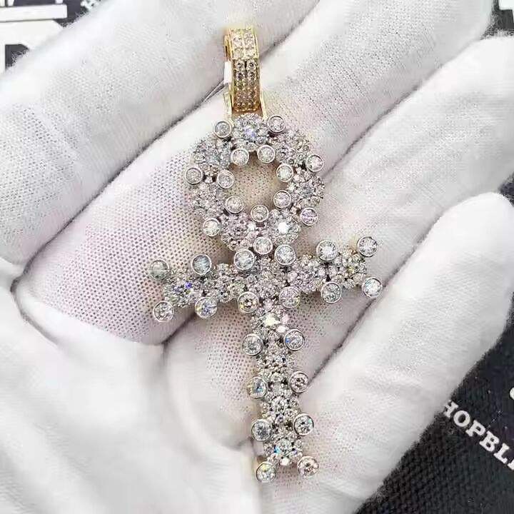 สร้อยคอจี้รูปกางเขนชุบเงินประดับเพชรโมอิสซาไนต์ทรงกลมแบบหรูหรา สไตล์ฮิปฮอป เครื่องประดับคริสเตียนสำหรับผู้ชาย