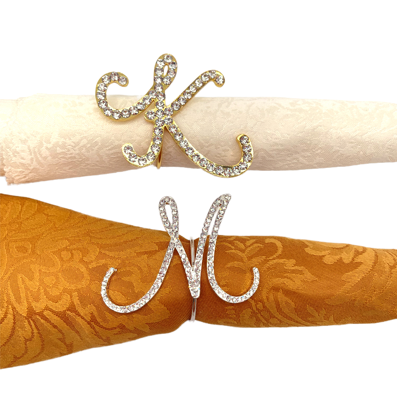 ห่วงรัดผ้าเช็ดปากชุบทองรูป K ของตกแต่งโต๊ะผลิตจากโลหะพลอยเทียมเป็นมิตรกับสิ่งแวดล้อมปรับแต่งได้สำหรับงานแต่งงานงานสต็อกสินค้าจำนวนมากสำนักงาน