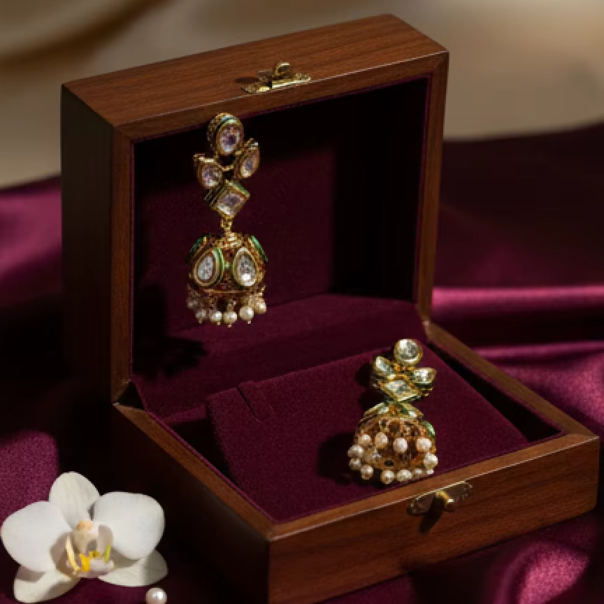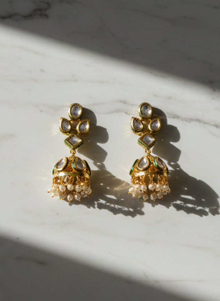 ต่างหูแบบห้อยประดับมุกและทองคำชุบแบบคุนดัน พร้อมรายละเอียดสีเขียว สำหรับเจ้าสาว ขายส่ง
