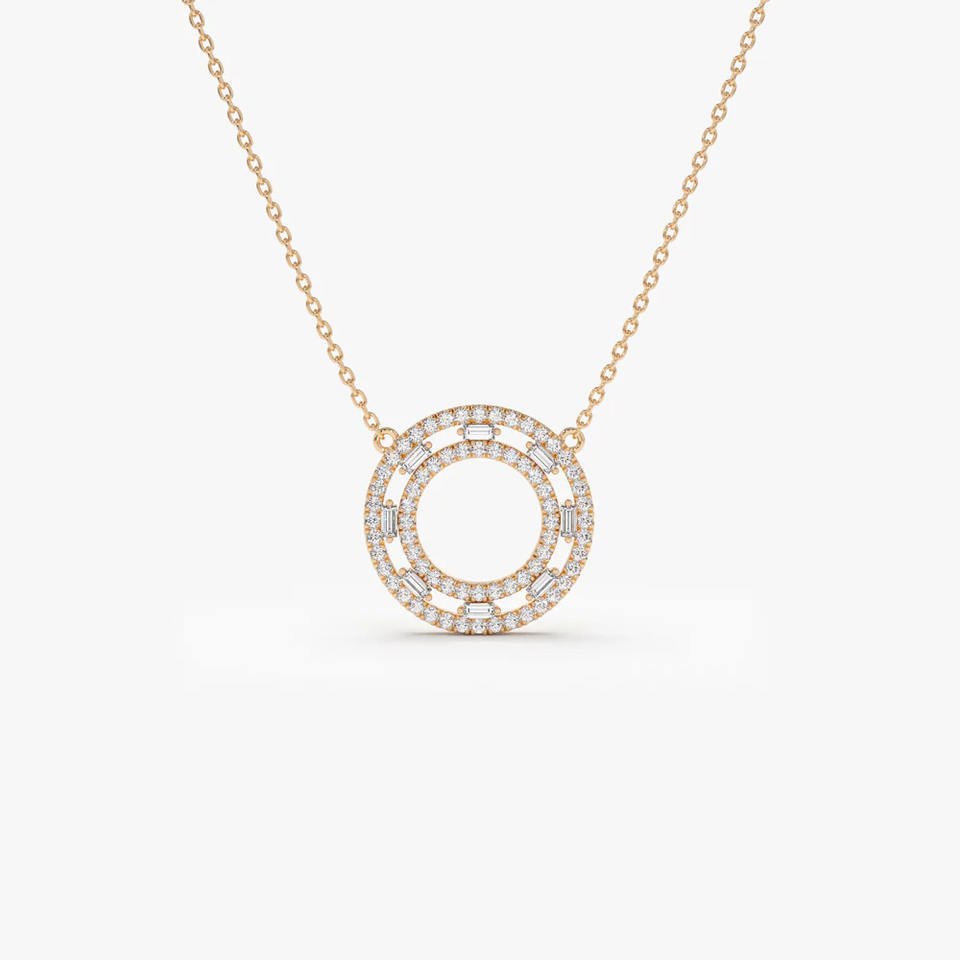Product name:14K Gold Open Double Circle Baguette & Round Cut Pendant Necklace