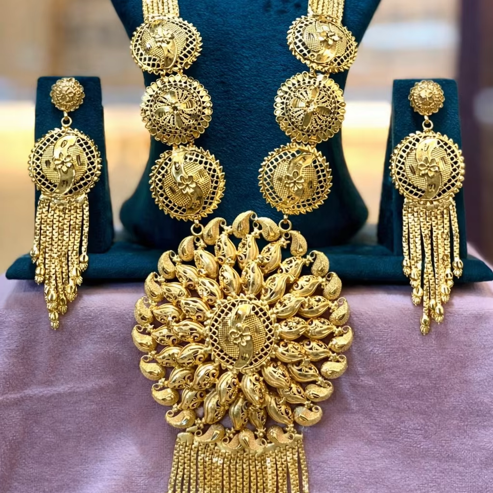 ชุดสร้อยคอยาวชุบทองประดับจี้ดอกไม้ขนาดใหญ่และต่างหูแบบจุมก้า เครื่องประดับเจ้าสาวระดับพรีเมียม ขายส่ง รุ่น 63006