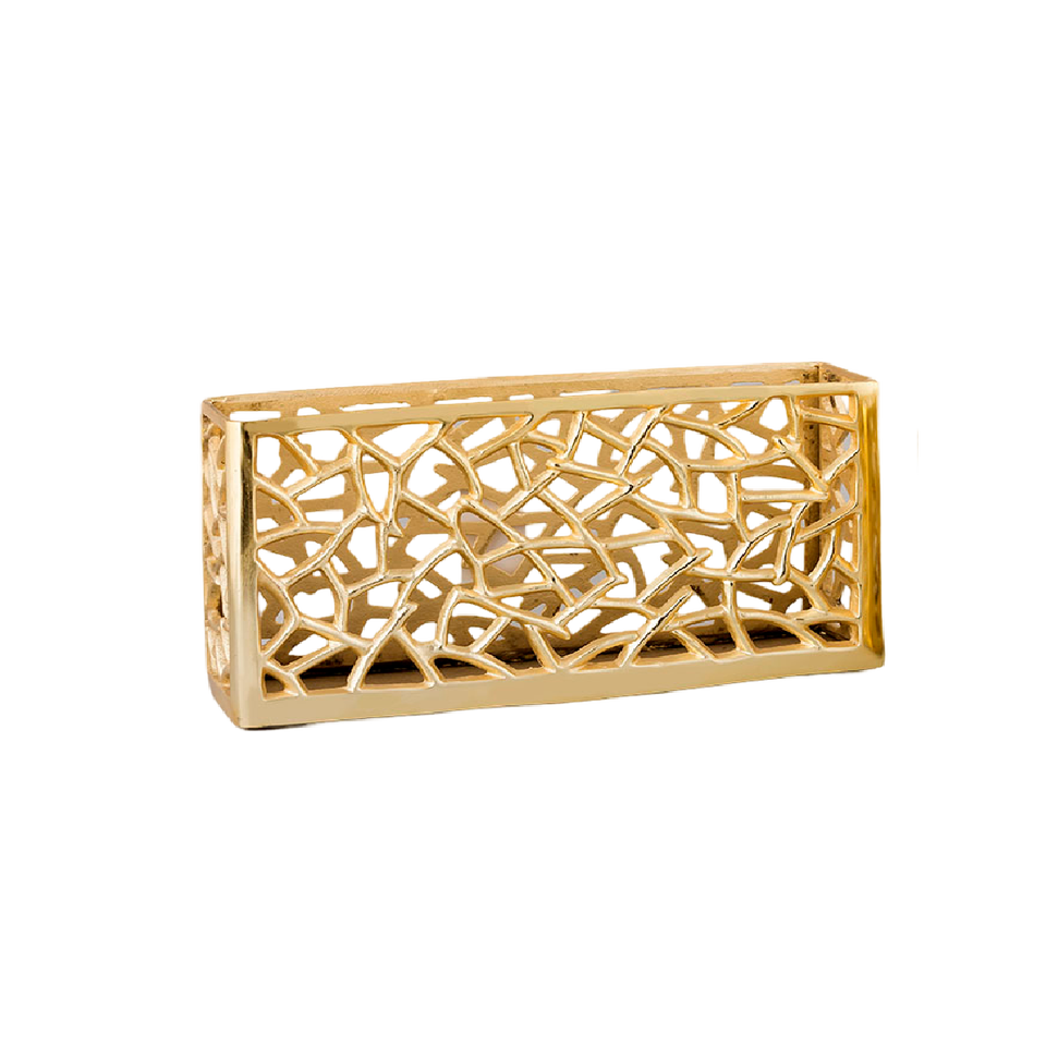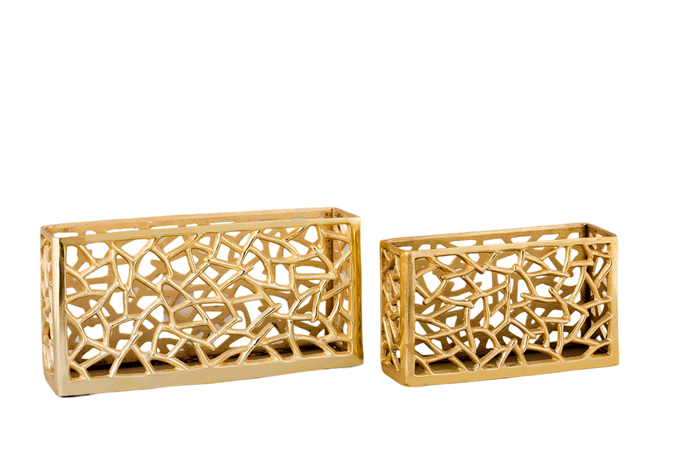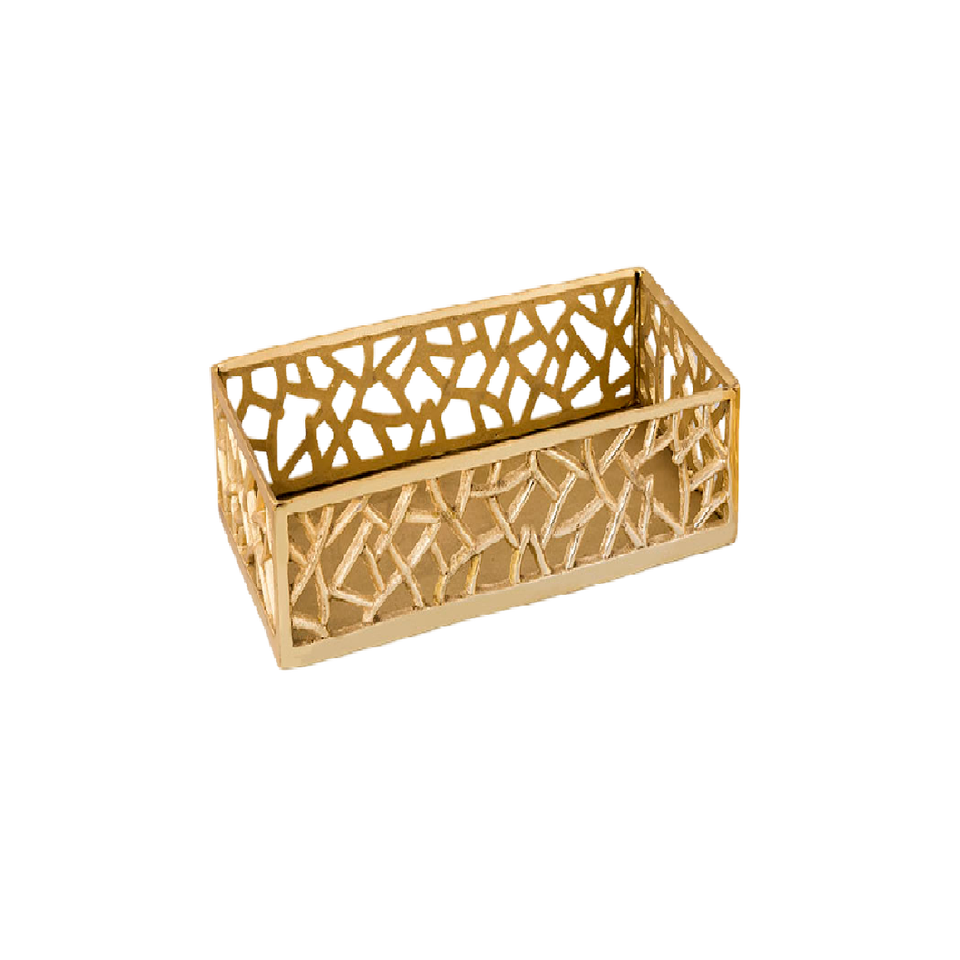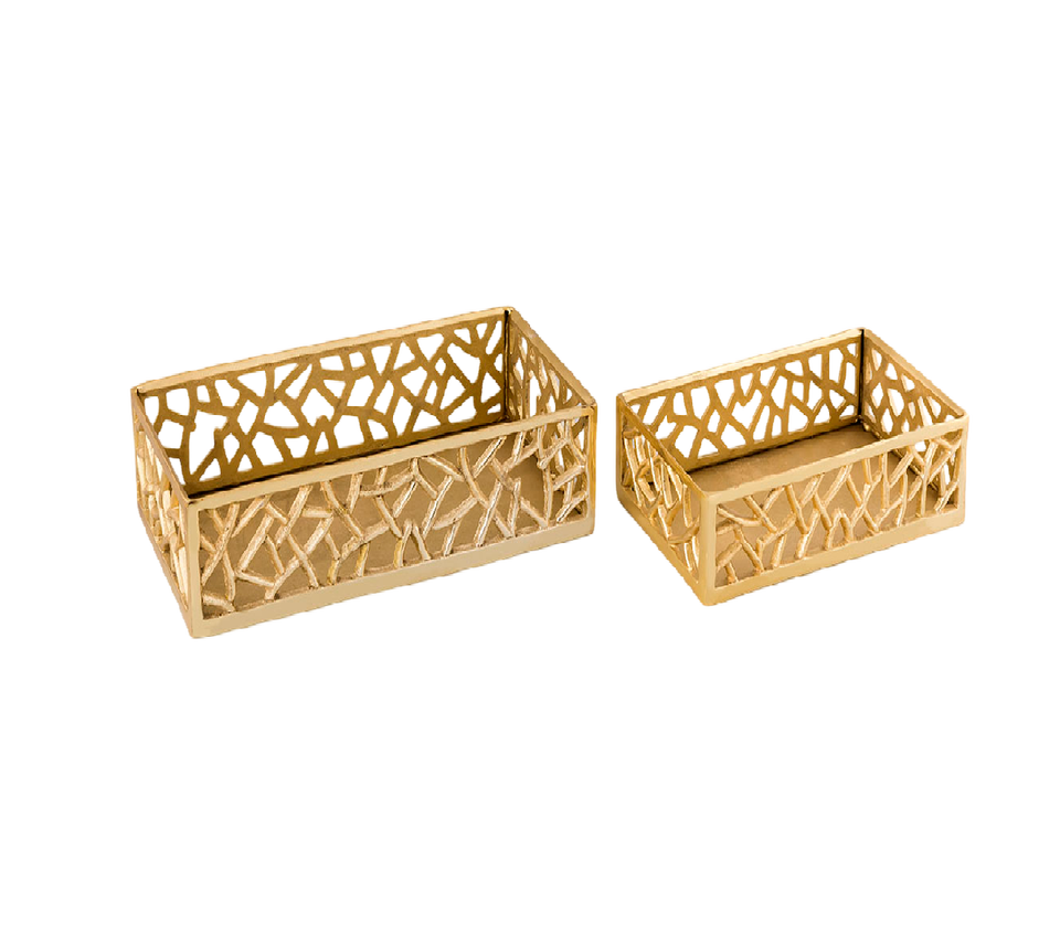 ถาดเสิร์ฟโลหะชุบทองทรงสี่เหลี่ยมผืนผ้าพร้อมที่จับและขอบลายนูนสำหรับอุปกรณ์สลัดในบ้านร้านอาหารโรงแรม
