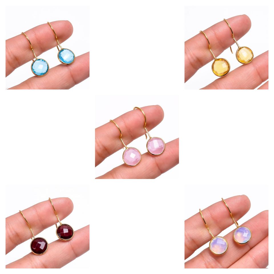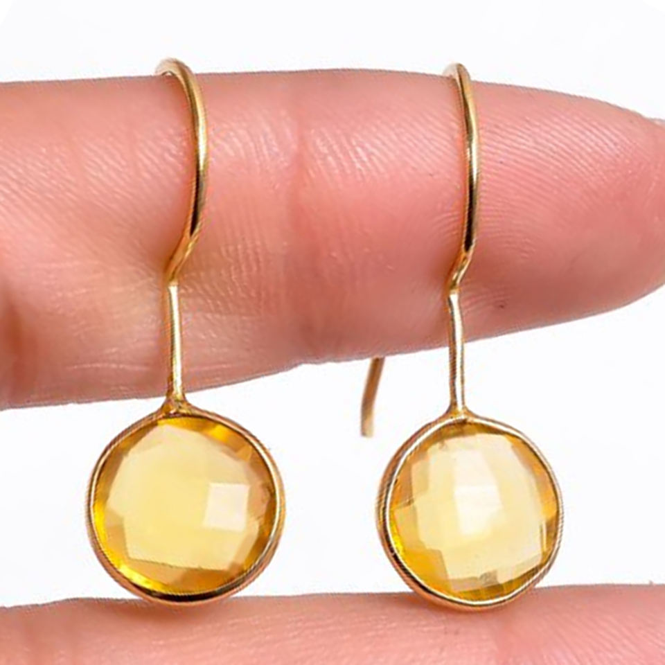 ต่างหูเพชรทรงเหลี่ยมเพชรพลอย Citrine ทรงกลมชุบทองต่างหูแบบห้อยขนาด8มม. ต่างหูหินทรงพีระมิด