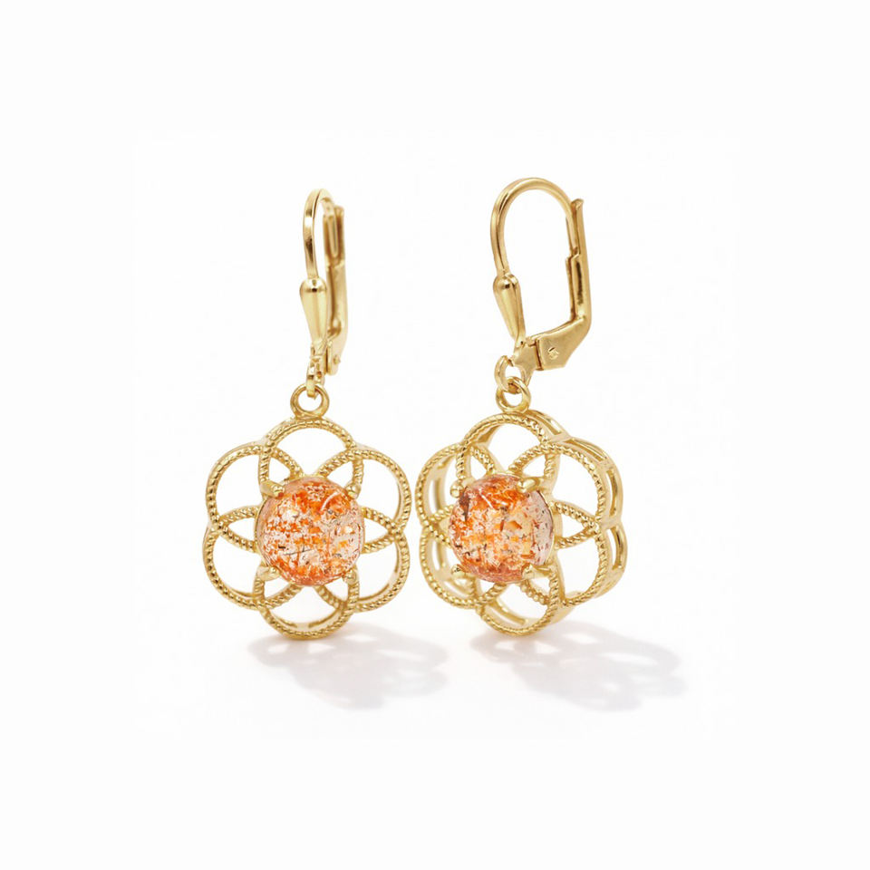 ต่างหูแบบหนีบประดับพลอยซันสโตนเคลือบทอง ดีไซน์ดอกไม้แบบตาข่าย ตกแต่งด้วยขาจับแบบหนีบ งานออกแบบทันสมัย