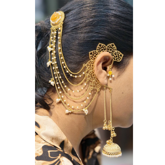 ต่างหูแบบหนีบหูชุบทองประดับหินสีเหลือง บาฮูบาลี พร้อมจุมก้าและสายคล้องผมประดับมุกแบบห้อย ซาฮารี เครื่องประดับเจ้าสาวอินเดียสำหรับผู้หญิง