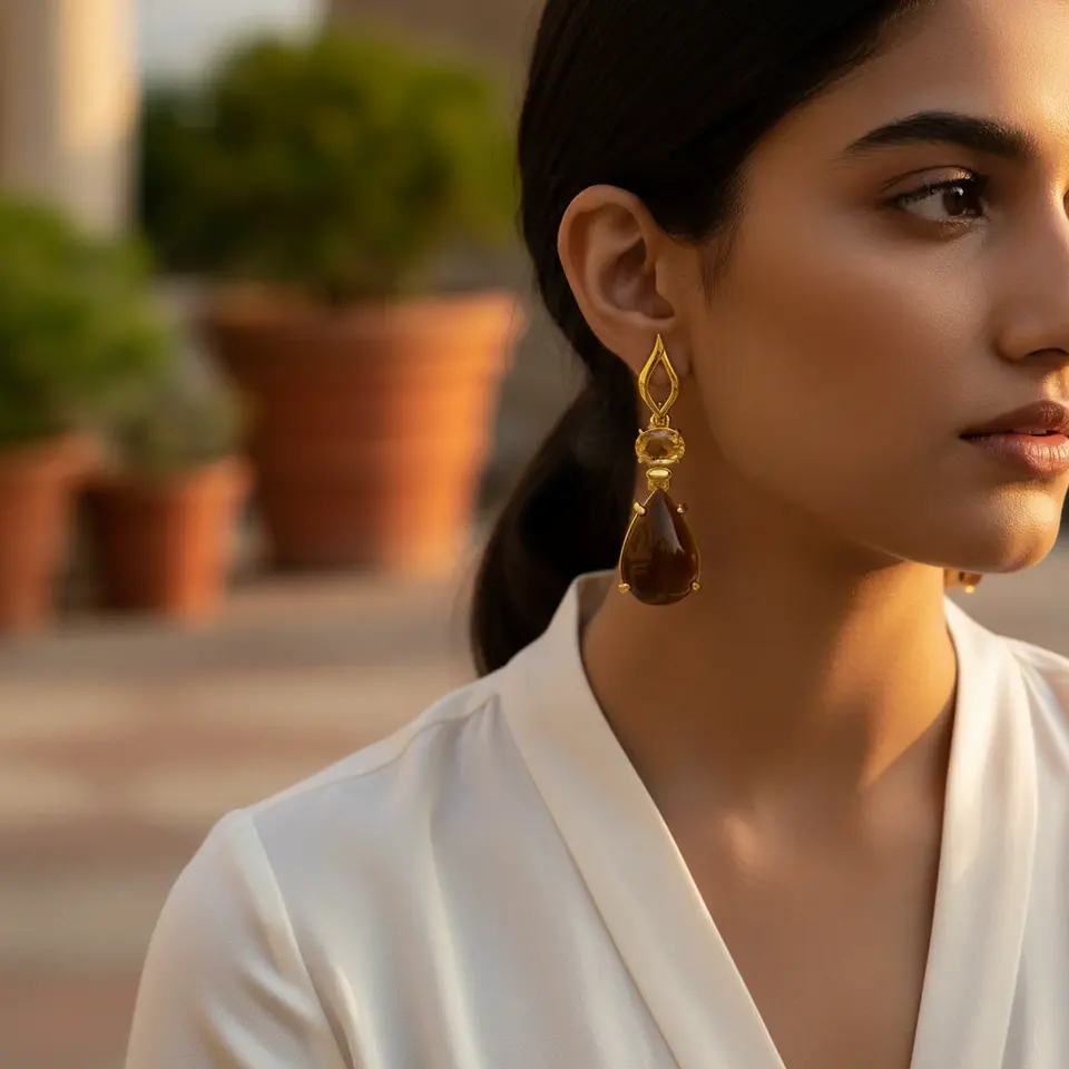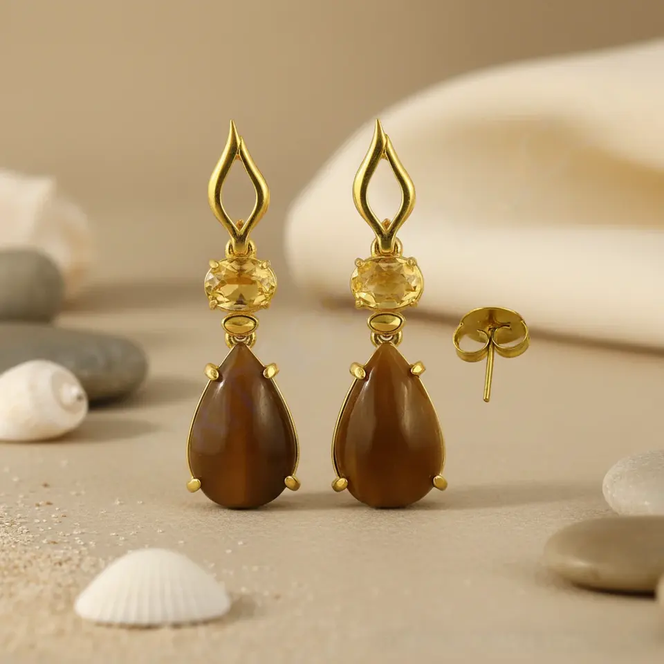 ต่างหูทรงหยดน้ำชุบทองประดับด้วยพลอยซิทรินและพลอยสีน้ำตาล ของขวัญแฟชั่นสำหรับเธอ