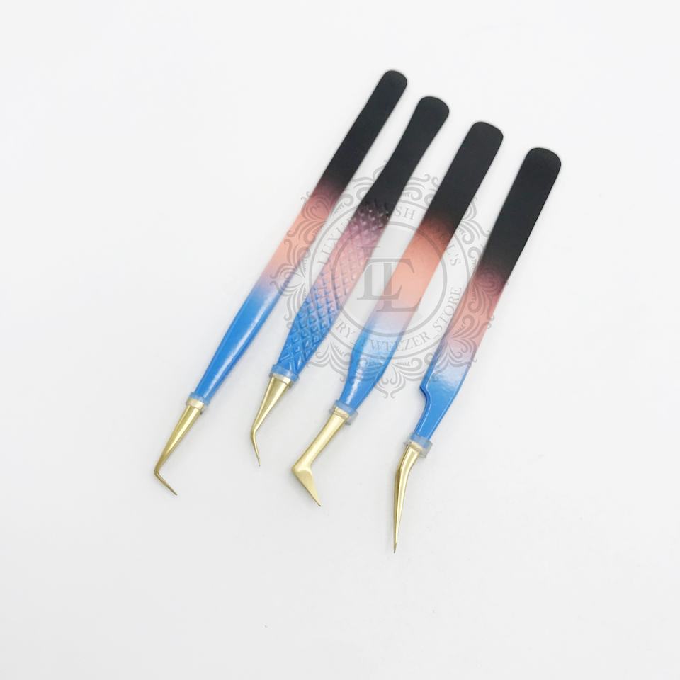 แหนบสำหรับต่อขนตาสแตนเลสแบบสามแฉกเคลือบผงแหนบปลายแหลมสีทองฉลากตามสั่งแบบมืออาชีพคุณภาพระดับพรีเมียม
