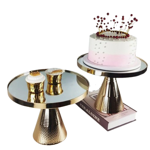 แท่นวางเค้กโลหะสำหรับตกแต่งโต๊ะงานแต่งงานอุปกรณ์ทำเค้กแบบปรับแต่งได้อุปกรณ์ตกแต่งเค้กด้วยโลหะขัดเงาสีทอง