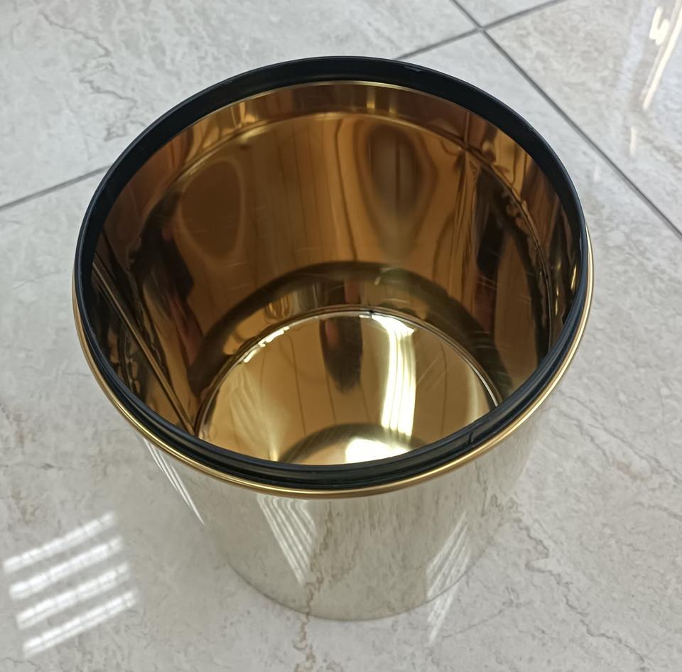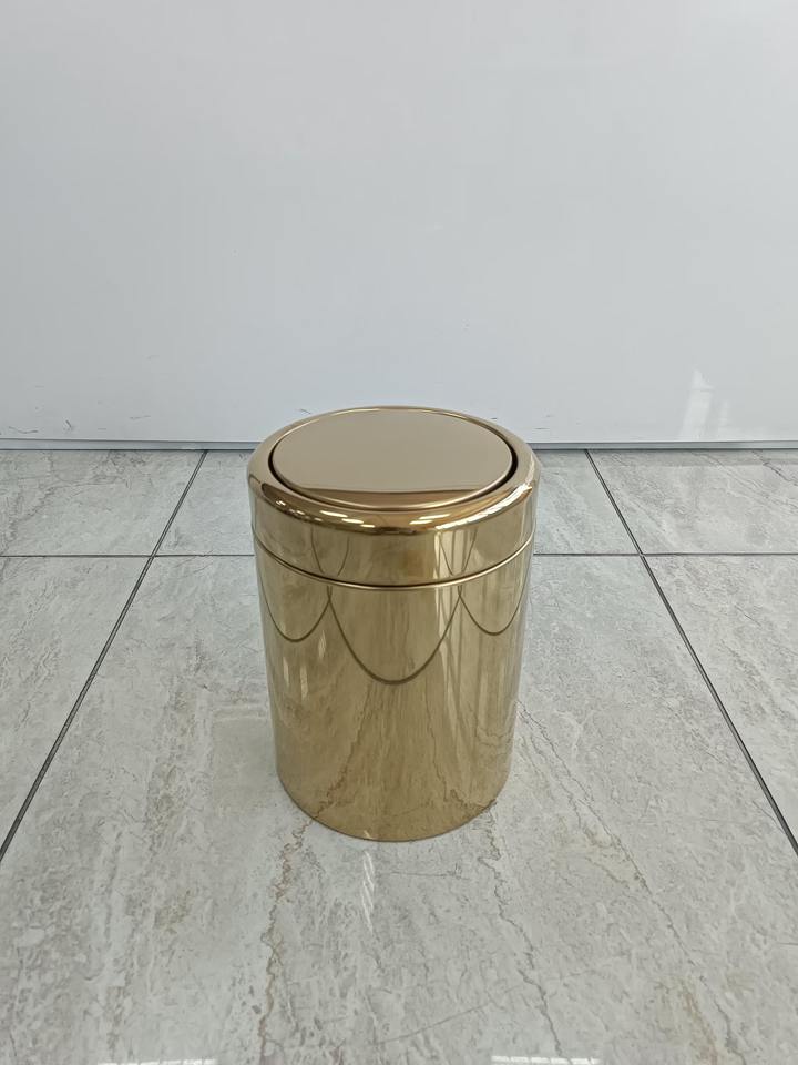 ถังขยะฝาเปิด-ปิดแบบสวิง ทำจากสแตนเลสขัดเงาสีทอง เหมาะสำหรับใช้ในห้องน้ำ ห้องครัว สำนักงาน หรือพื้นที่ที่เป็นทางการ ขายส่งจากอินเดีย