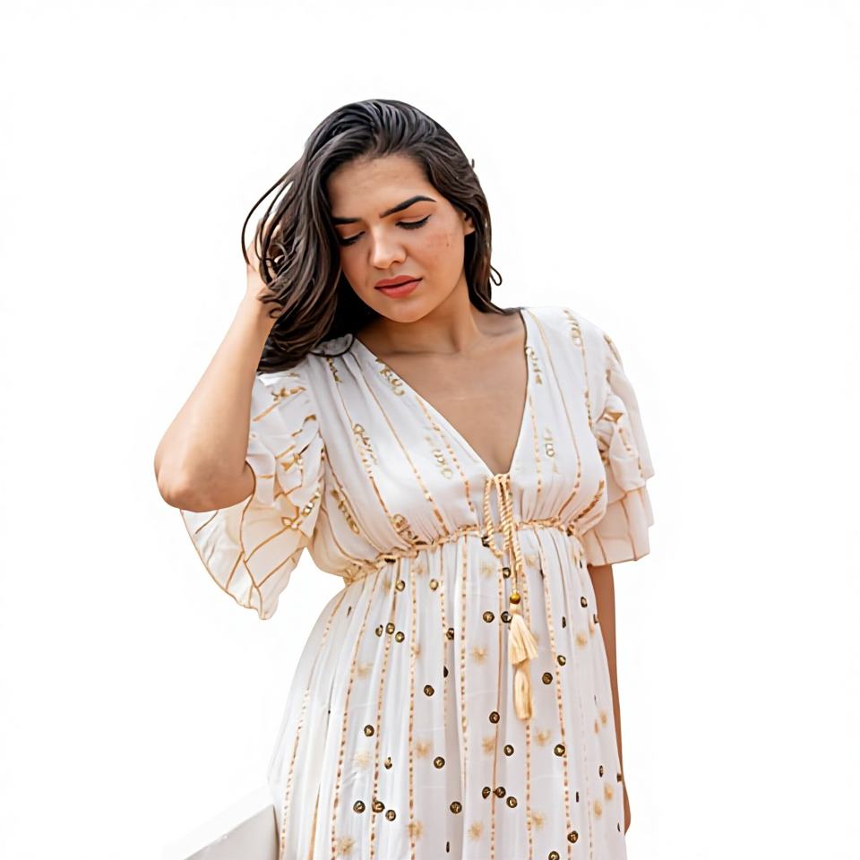 เดรสผ้าฝ้ายสีงาช้างพิมพ์ลายทอง ทรงเอไลน์ ความยาวปานกลาง เอวธรรมชาติ ซักได้ เป็นมิตรต่อสิ่งแวดล้อม สไตล์โบฮีเมียน พิมพ์ลายดิจิทัล เหมาะสำหรับงานปาร์ตี้ ฤดูร้อน