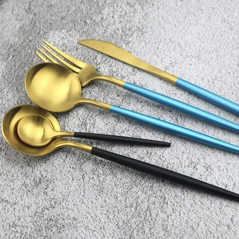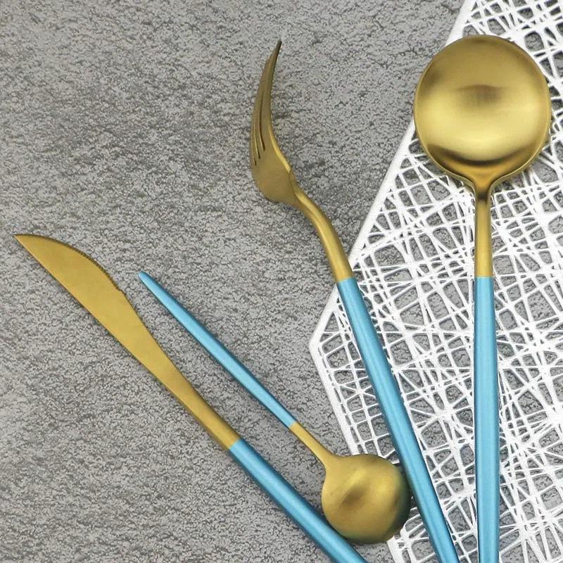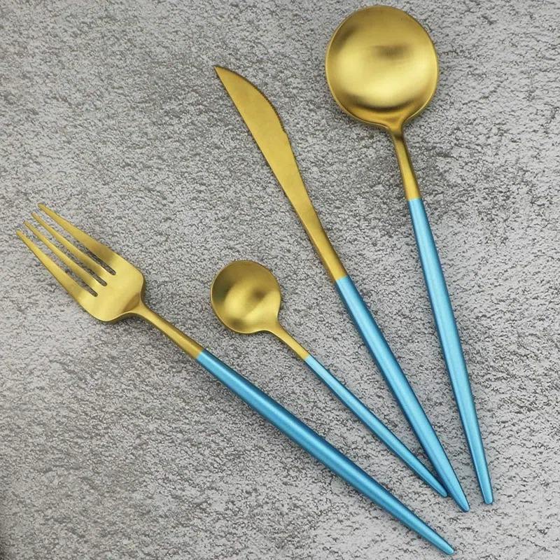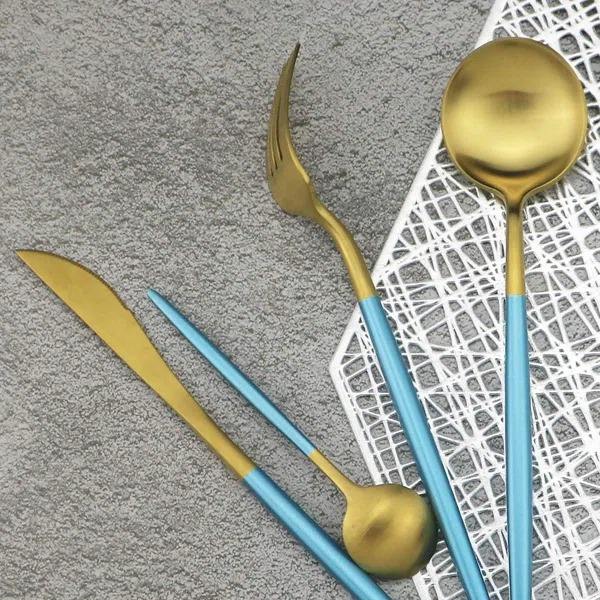 ชุดมีดด้ามเรซินสีฟ้าหัวกลมสีทองเครื่องใช้บนโต๊ะอาหารหรูหราสำหรับรับประทานอาหารที่บ้านงานแต่งงานงานเลี้ยงร้านอาหาร