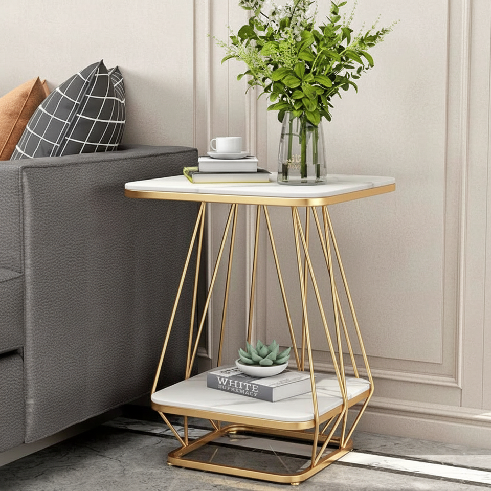 โต๊ะโซฟาทรงสี่เหลี่ยมมีโครงโลหะด้านบนสีทองและสีขาวพร้อมห้องนั่งเล่นแบบเรียบง่ายโต๊ะกาแฟโต๊ะมุมสำหรับห้องนอน