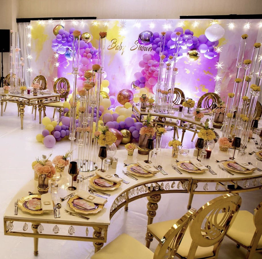 โต๊ะรับประทานอาหารทรงครึ่งวงกลม สแตนเลสสีทอง ดีไซน์หรูหราทันสมัย สำหรับงานแต่งงาน โรงแรม และใช้งานกลางแจ้ง