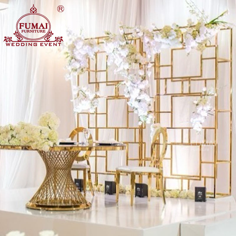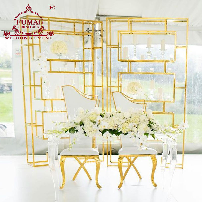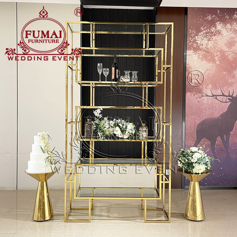 ชั้นวางไวน์สแตนเลสสีทองสำหรับร้านอาหารชั้นวางไวน์โลหะสำหรับตกแต่งงานเลี้ยงบาร์ด้านหลังงานแต่งงาน