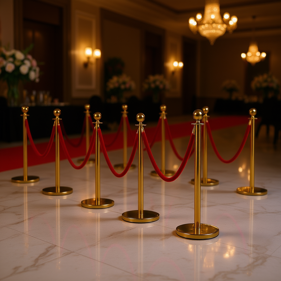 ชุดเสาเหล็กสีทอง 4 เสา 3 เส้น เชือกกำมะหยี่สีแดง หัวเสาทรงกลม สแตนเลส สำหรับตกแต่งงานปาร์ตี้ พรมแดง