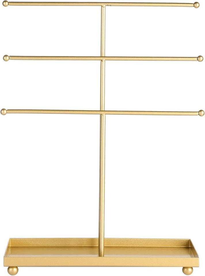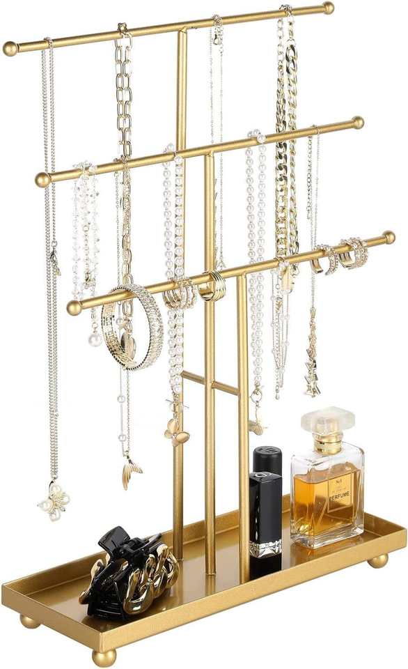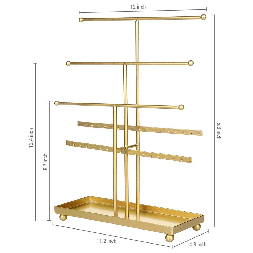 ที่วางเครื่องประดับโลหะสีทองพร้อมถาดใส่แหวน สร้อยคอ กำไล ต่างหู ดีไซน์หรูหราสำหรับวางโชว์บนโต๊ะเครื่องแป้ง