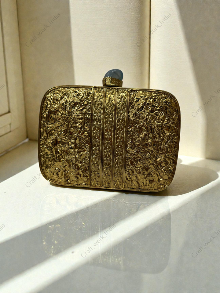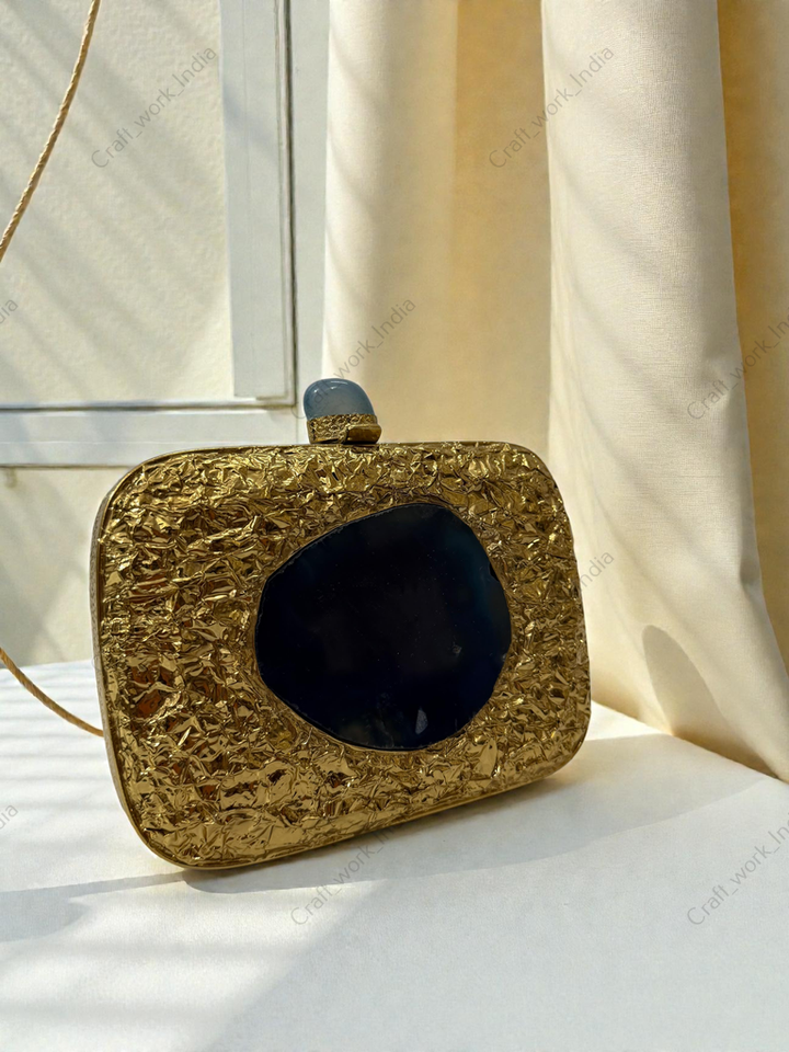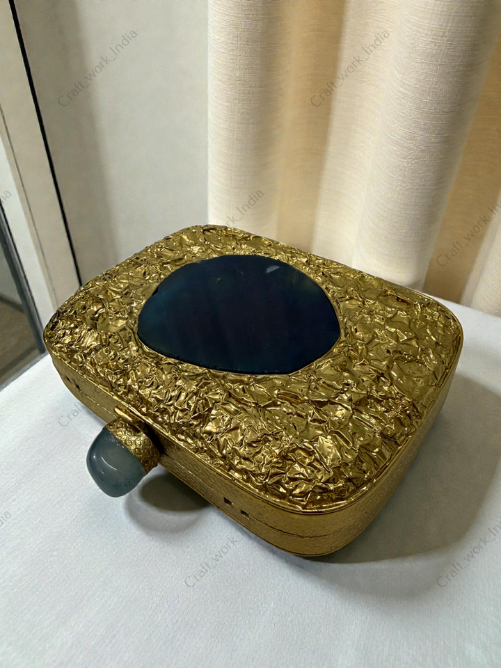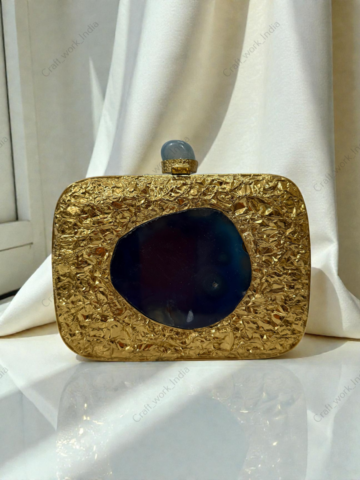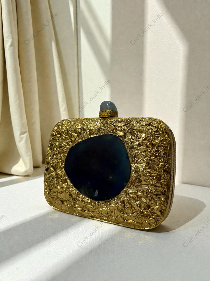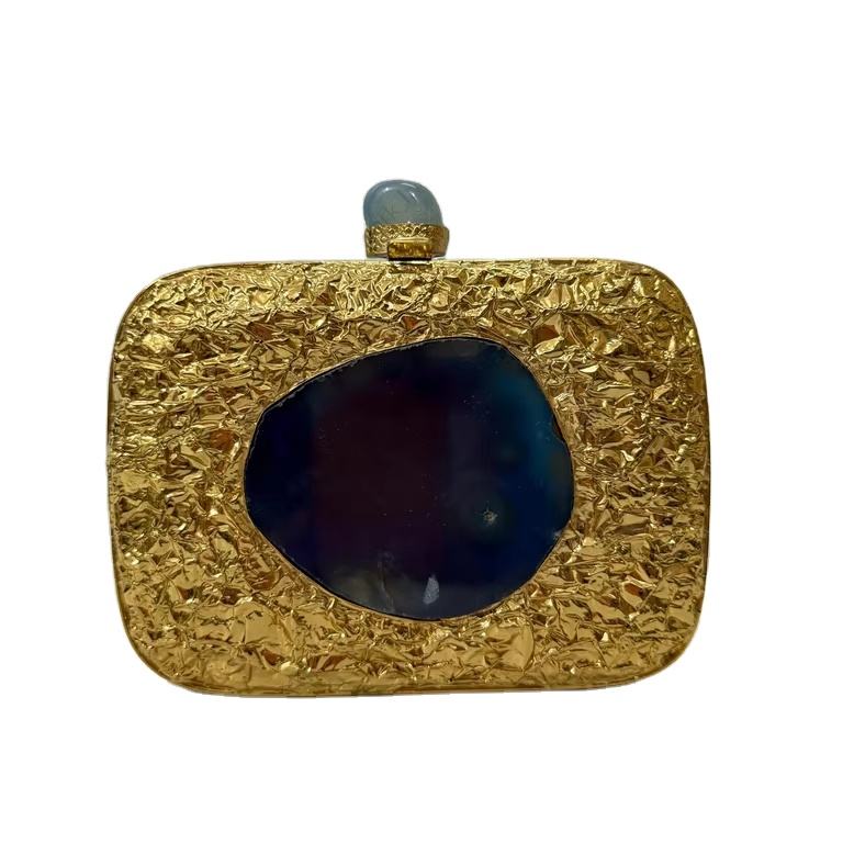 กระเป๋าคลัทช์โลหะสีทองลายเท็กซ์เจอร์ ประดับแผ่นหินอาเกตทรงรี งานแฮนด์เมด สำหรับงานเลี้ยงกลางคืน งานแต่งงาน หรือโอกาสพิเศษ สไตล์หรูหรา