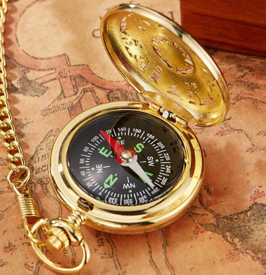 เข็มทิศทองเหลืองกระเป๋าสีทองพร้อมหน้าปัดสีดำเข็มเรืองแสงและฝาบานพับที่หรูหราบนโซ่