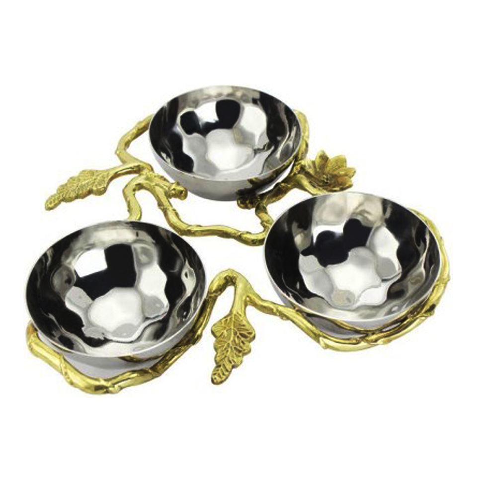 Gold Tree Branches Round and Floral Stand Stainless Steel Nut and Dry Fruits Tri Bowls Wholesale and Manufacturers