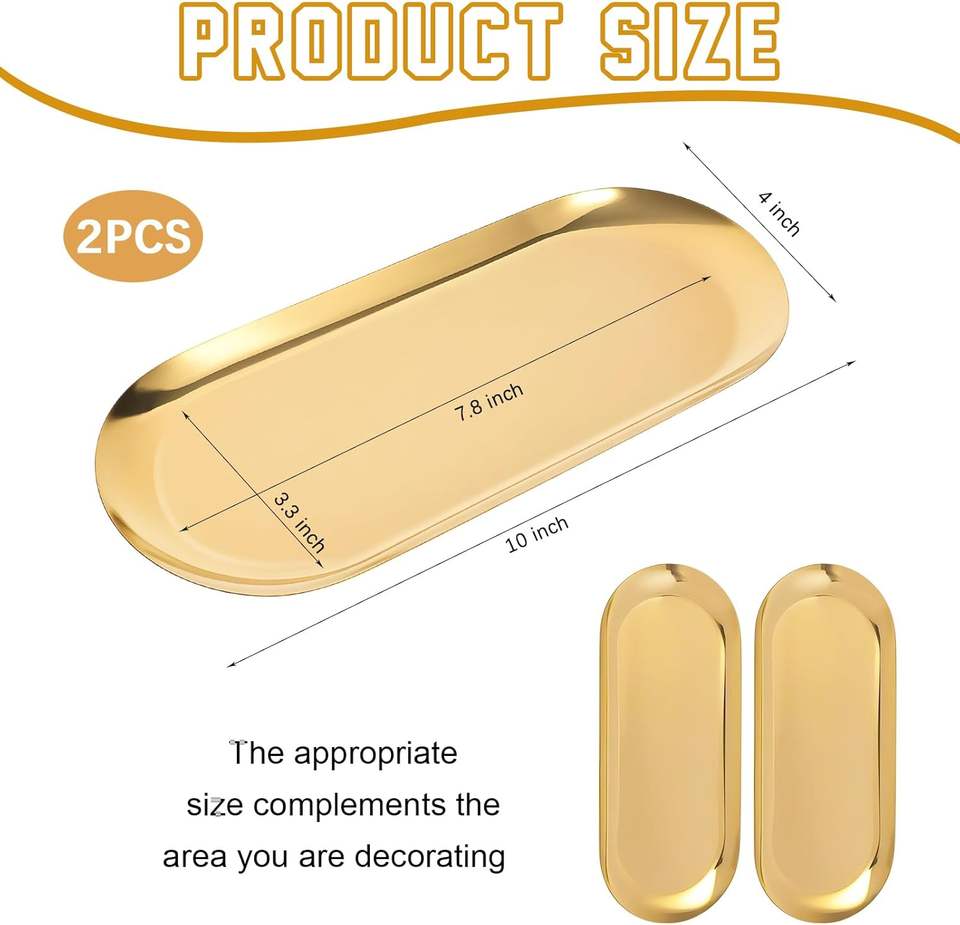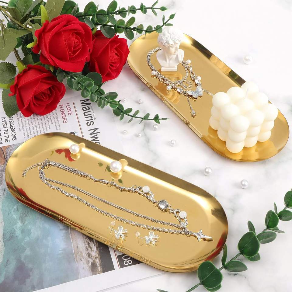 ถาดใส่เครื่องประดับและของจิปาถะสีทอง ถาดจัดระเบียบห้องน้ำตกแต่งสีทอง ชุดถาดเก็บของเก่า ถาดวางของอเนกประสงค์สแตนเลสสีทอง รูปทรงวงรี