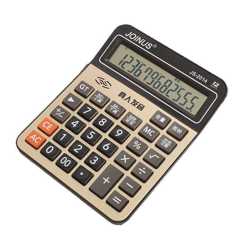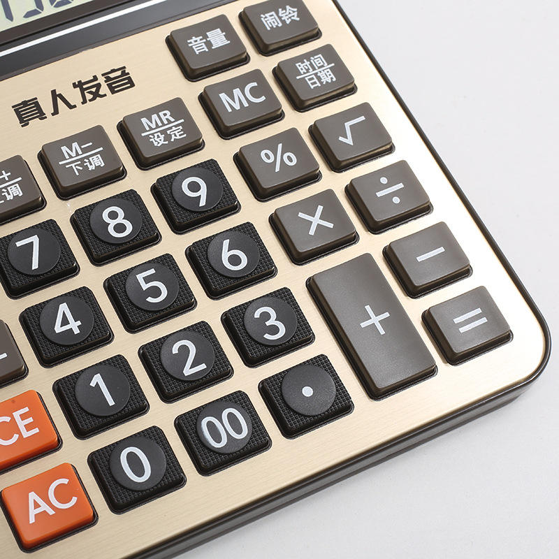 เครื่องคิดเลขโกลด์วอยซ์พร้อมจอแสดงผลขนาดใหญ่และฟังก์ชั่นหลากหลายสำหรับใช้ในสำนักงาน ตัวเครื่องทำจากอลูมิเนียมอัลลอย