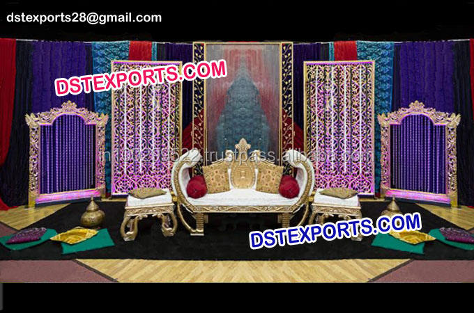 เวทีแต่งงานสีทองพร้อมฉากหลังคัตเอาท์,ชุดแต่งงานปากีสถานชุดเวทีที่ยอดเยี่ยมการต้อนรับงานแต่งงานการตกแต่งเวทีกลางคืน