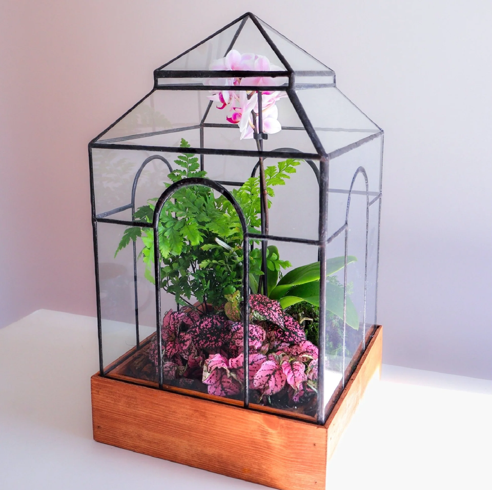 เทอราเรียมแก้วทรงเรขาคณิตกรอบสีทองรูปทรงหยดน้ำหยดแขวนอยู่บนขาตั้งทองเหลืองที่เข้ากันจัดแสดงต้นไม้น้อยที่สุดในราคาขายส่ง
