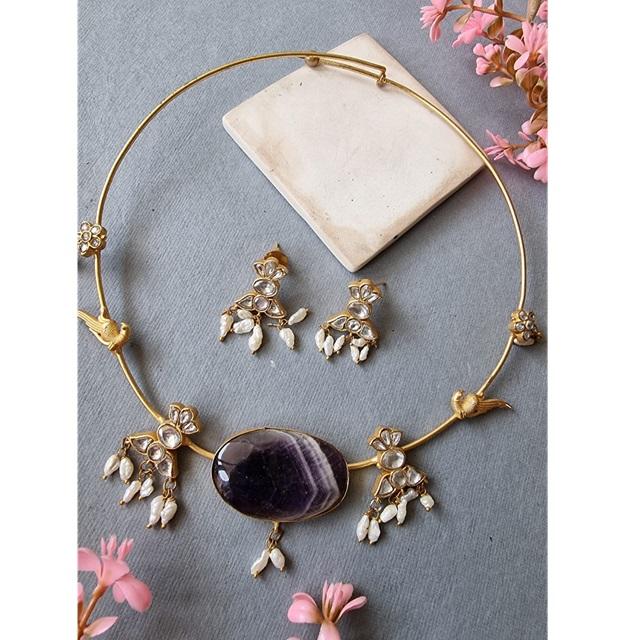 ชุดอเมทิสต์ดอกไม้บานสีทองสร้อยคอและต่างหูชุดกลีบดอกไข่มุกสำหรับงานแต่งงานสำหรับผู้หญิง
