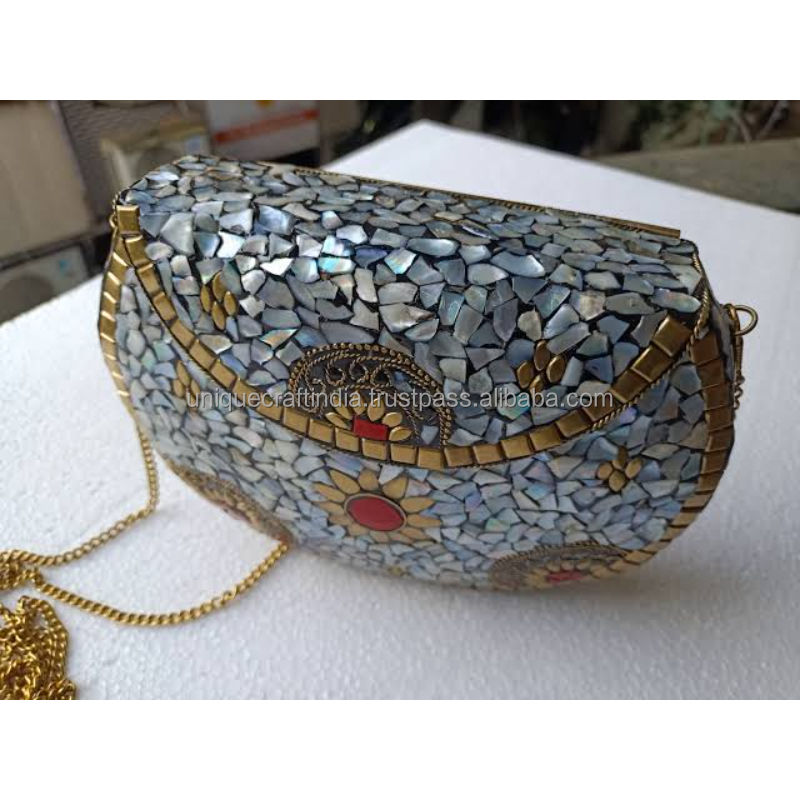 กระเป๋าถือทองเหลืองและเรซินสีทองพร้อมลายดอกไม้สีดำและสายโซ่สำหรับงานปาร์ตี้และงานแต่งงาน