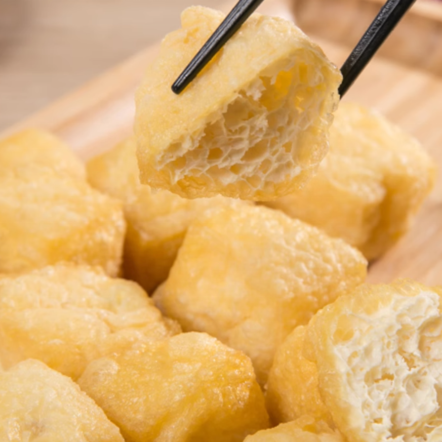 เต้าหู้พัฟสีน้ำตาลทอง โปร่งและเบา เหมาะสำหรับดูดซับน้ำซุปและซอส บรรจุภัณฑ์แบบแช่แข็งจำนวนมาก