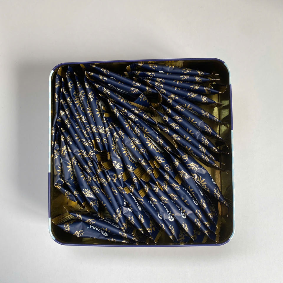 คุกกี้เนยทองคำ 320 กรัม ขนมบิสกิตหวาน กล่องเหล็กสีน้ำเงิน ผู้ผลิตแบบ OEM