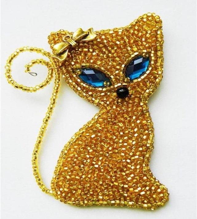 เข็มกลัดรูปแมวสีทอง ประดับด้วยลูกปัดแก้วปักมือ พร้อมคริสตัลสีฟ้าที่ดวงตาและดีเทลโบว์ เข็มกลัดติดปกเสื้อสุดหรูสำหรับคนรักสัตว์เลี้ยง