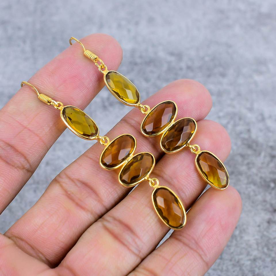 Golden Citrine Four Gemstone Oval Shape 925 Sterling Silver Gold Plated Dangle Drop Earring for Women Dainty Mother Earring Gift