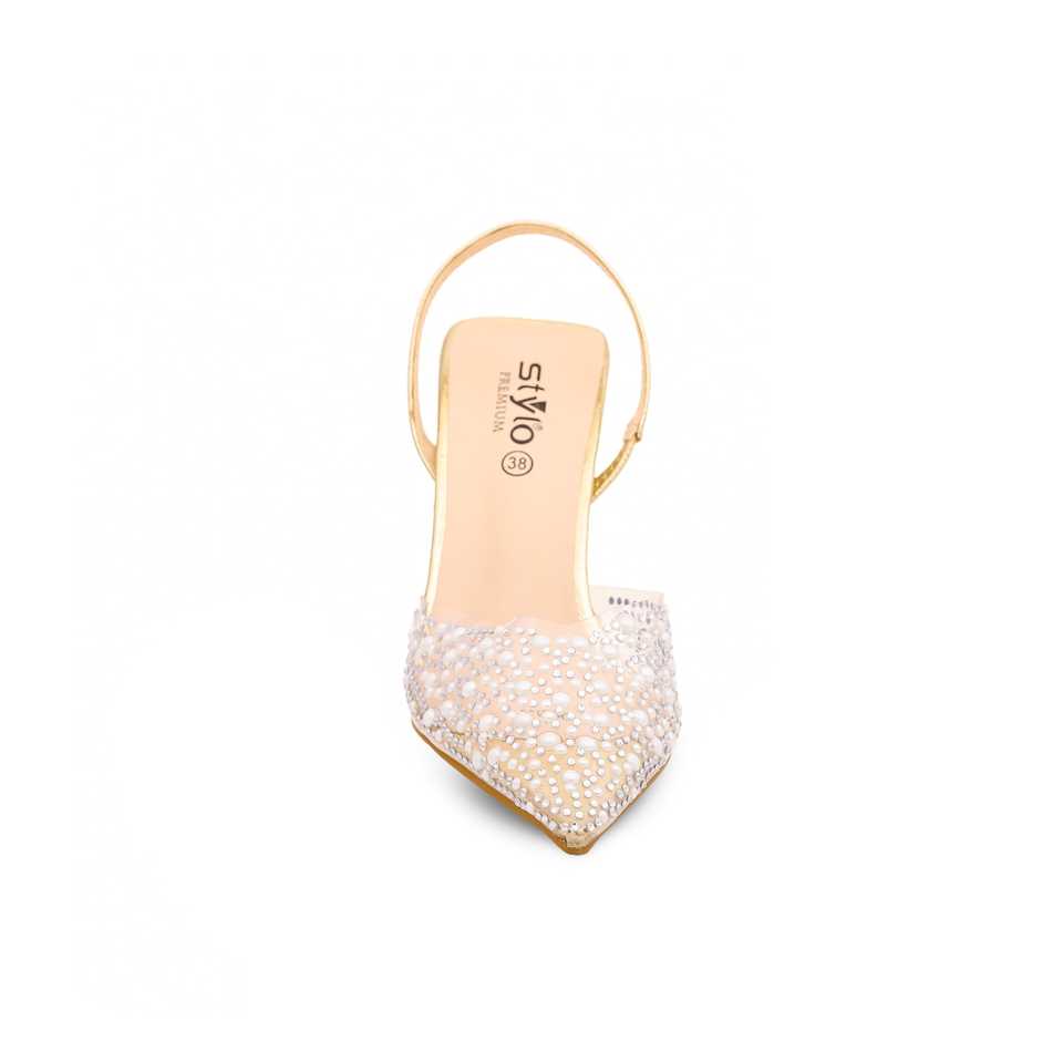รองเท้าส้นเข็ม WN7343สีทองสำหรับสำนักงานหรืองานแต่งงานรองเท้าส้นเข็มบาง12ซม. และตกแต่งด้วยพลอยเทียม5ซม.