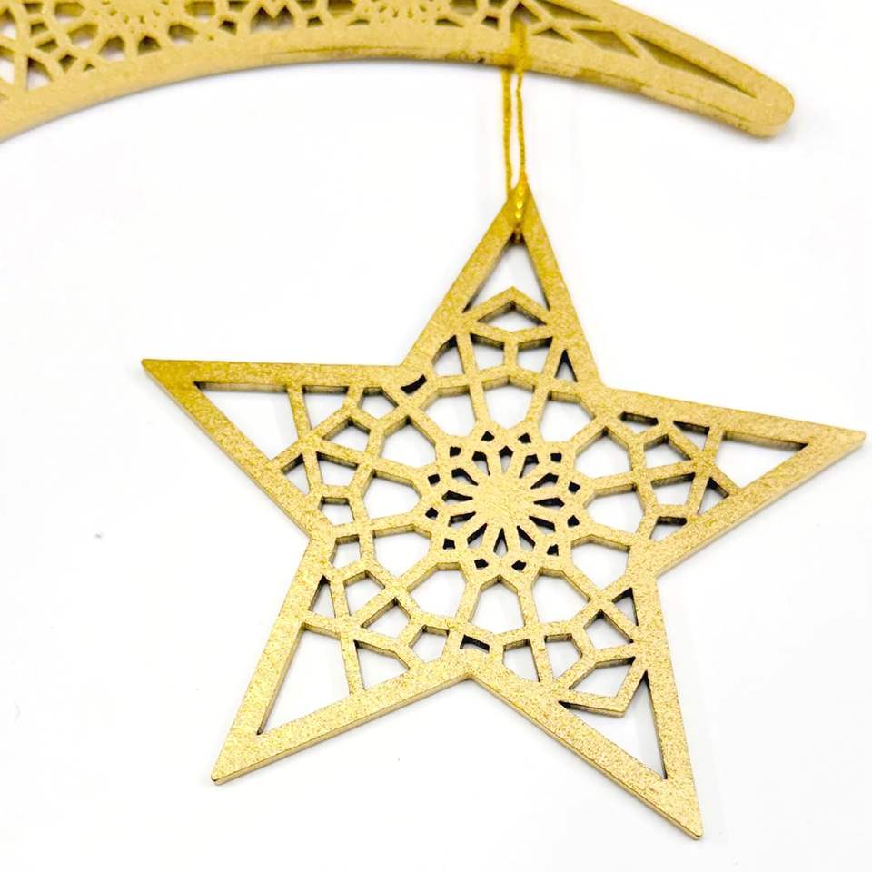 ที่ตั้งโต๊ะไม้แนวตั้งสีทองรูปพระจันทร์เสี้ยวและดาว Eid Mubarak รอมฎอนทำจากไม้ที่ทันสมัยสำหรับตกแต่งบ้าน