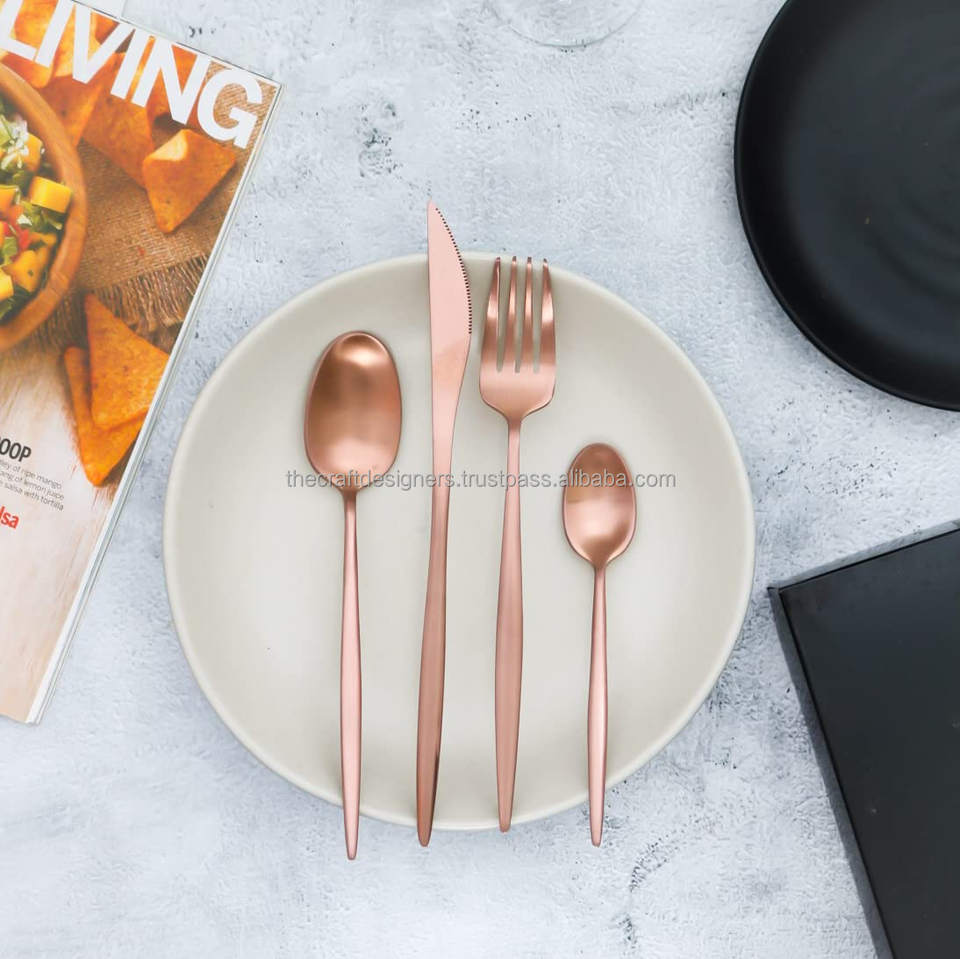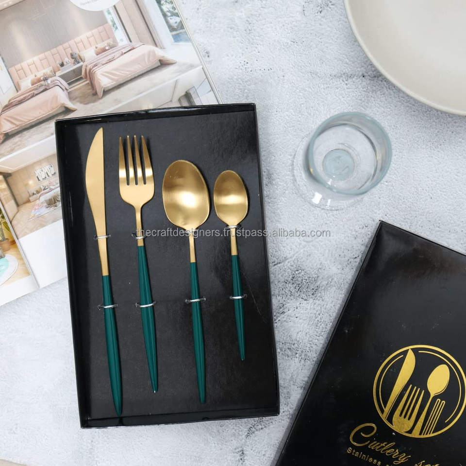 ชุดช้อนส้อมสีทองพร้อมที่จับสีเขียวสำหรับตกแต่งงานแต่งงานเครื่องเงินแบบโปรตุเกสชุดมีดแบบบางมาก