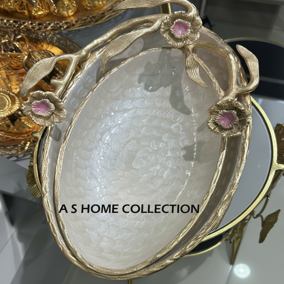 ถาดเสิร์ฟผลไม้และช็อคโกแลต ดีไซน์กิ่งไม้ดอกไม้สีทอง ด้ามจับตกแต่งหรูหรา ทำจากโลหะเคลือบสีขาว
