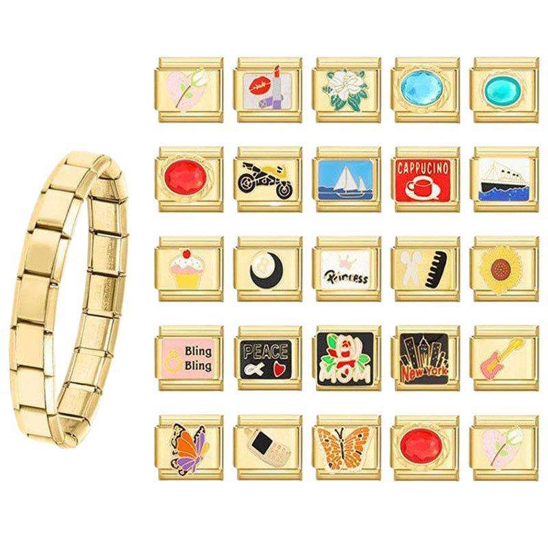 สร้อยข้อมือสไตล์อิตาลีสีทอง 20 ชิ้น แบบประกอบเองได้ เครื่องประดับแฟชั่นลำลองสำหรับทุกเพศ พร้อมจี้รูปผีเสื้อ ดอกไม้ อาหาร ความสงบสุข และดวงจันทร์