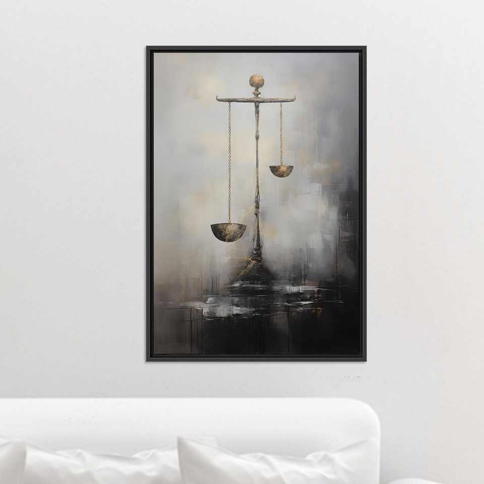 ภาพพิมพ์บนผ้าใบ "เครื่องชั่งความยุติธรรมสีทอง" ของตกแต่งสำนักงานกฎหมายสุดหรู ผ้าใบกรอบสีดำ